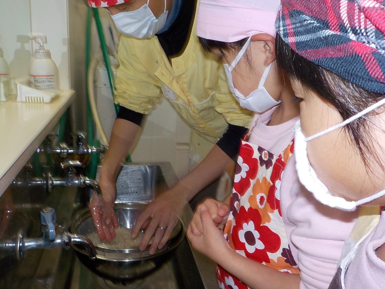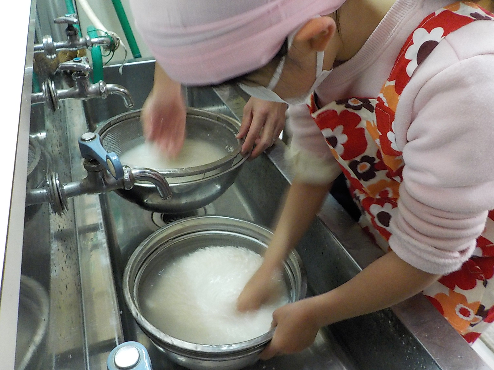 お米の洗い方を教えてもらい、冷たい水でも一生懸命洗います。
