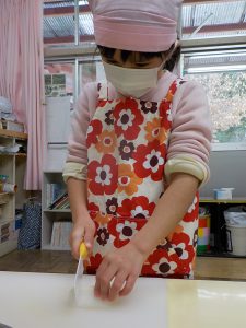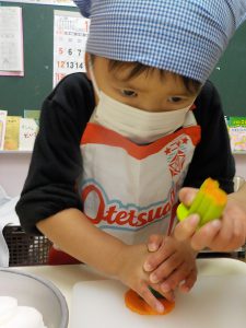 年長さんは包丁を使って野菜を切ります。切り方が上手です。