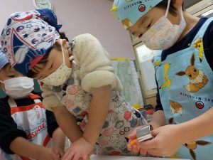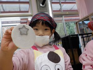 年中さん、年少さんは型抜きを使って野菜の型抜きをしました。