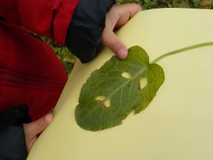 この葉っぱ顔に見えるかな・・・? 集めた葉っぱの中には面白いものがたくさんありました。