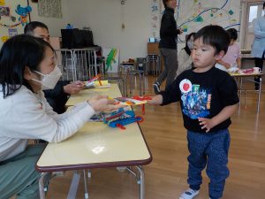 給食室で給食先生が調理してくれている間、子ども達は「お客さんと遊びたい〜。」と