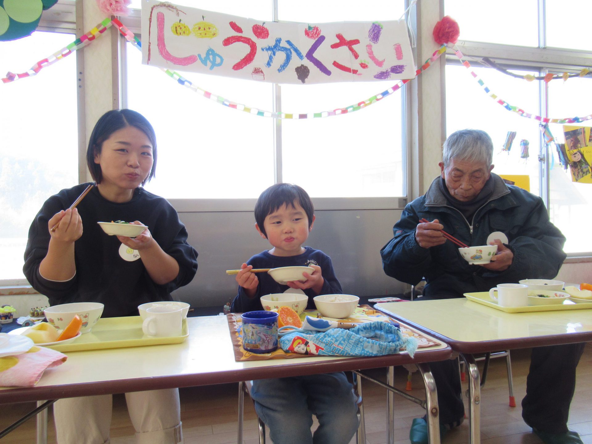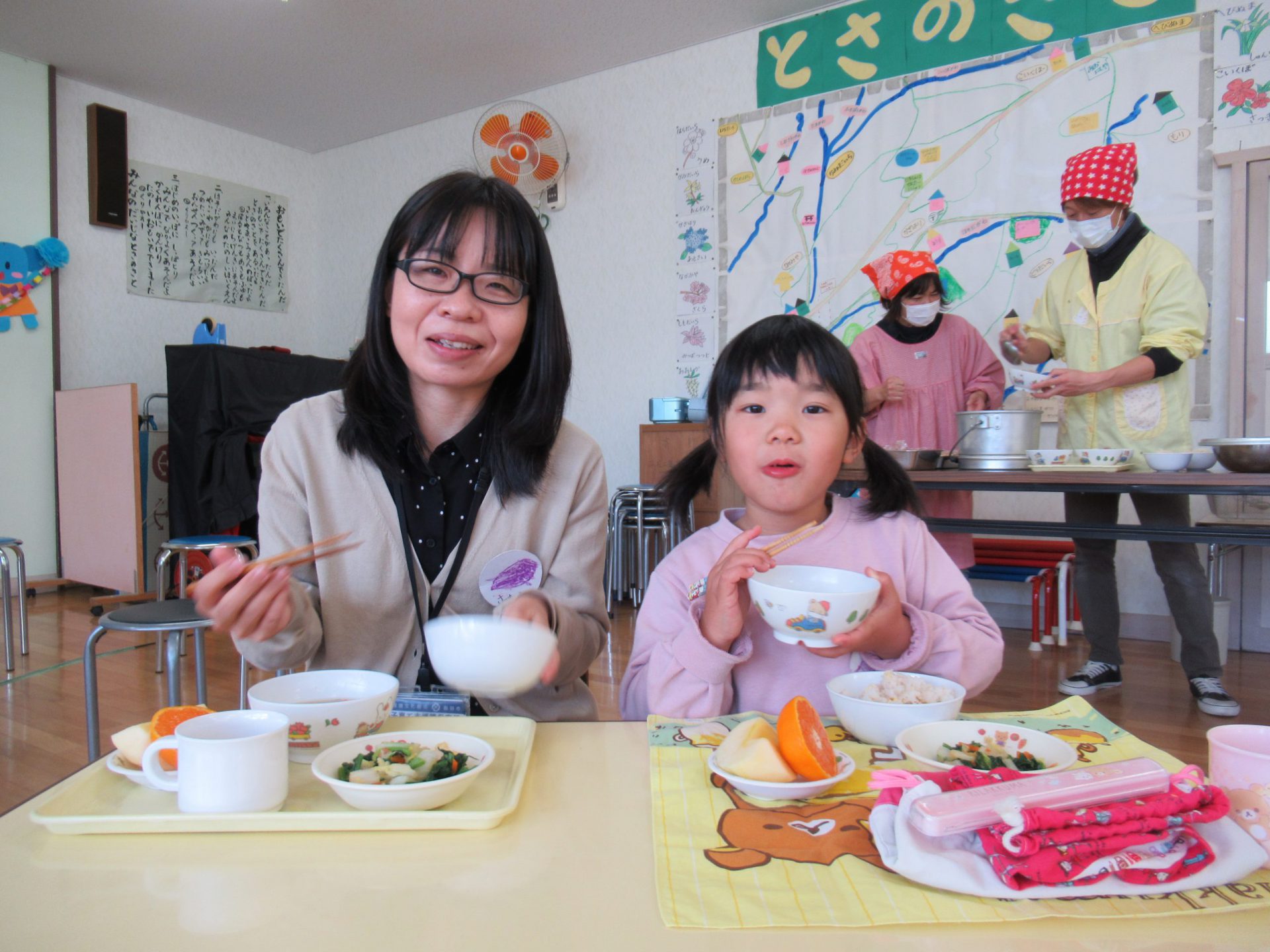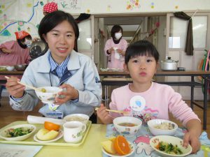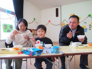 たくさん遊んでお腹がすいて、お待ちかねの給食です。