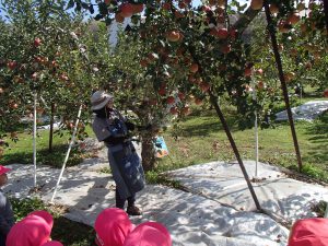 まずは農家さんからりんごの種類や収穫方法についてお話を聞きます。