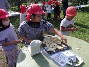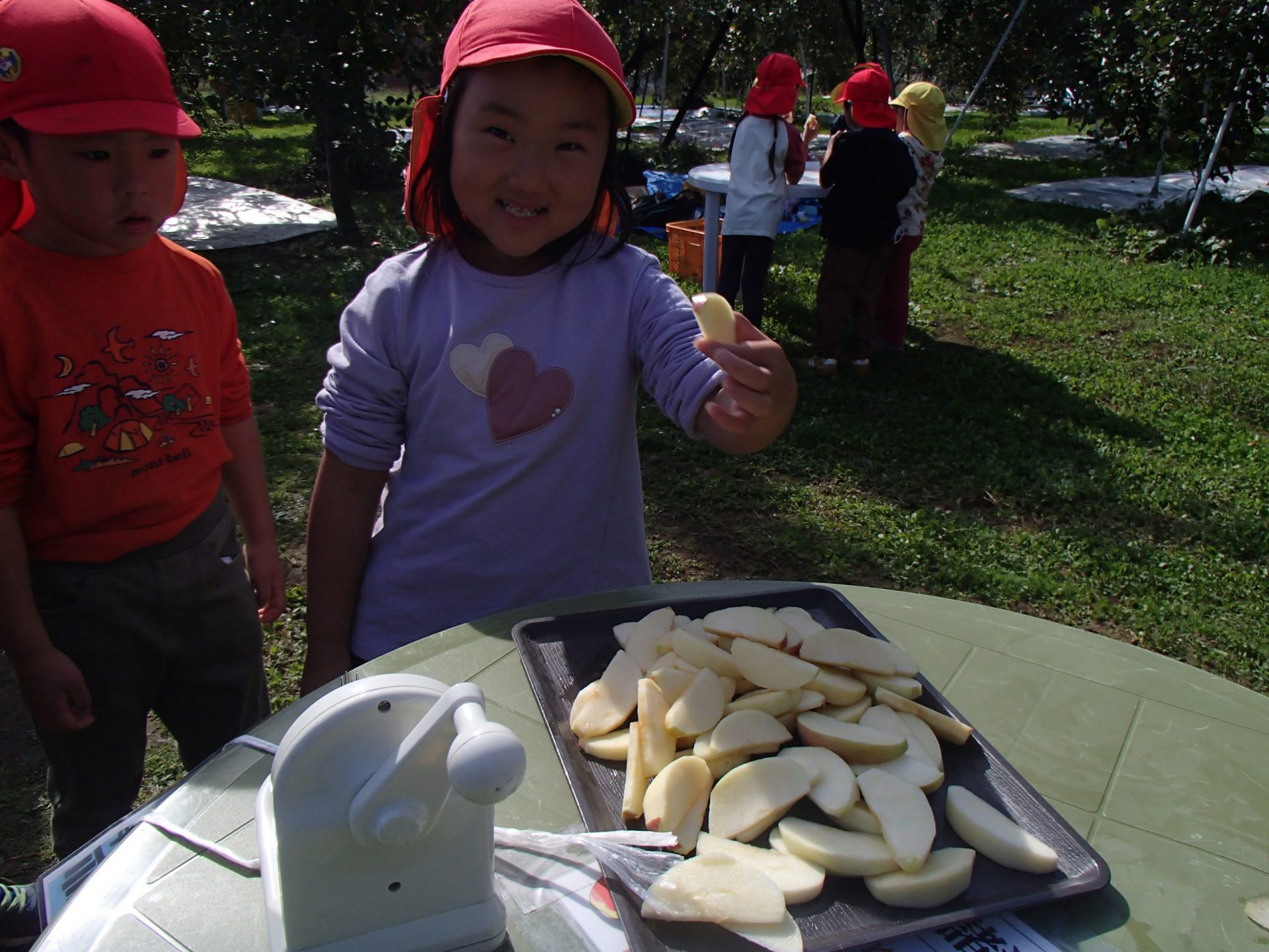 普段はお店に並んだりんごを見たり、お家や給食で切ってもらったりんごを食べている子どもたち