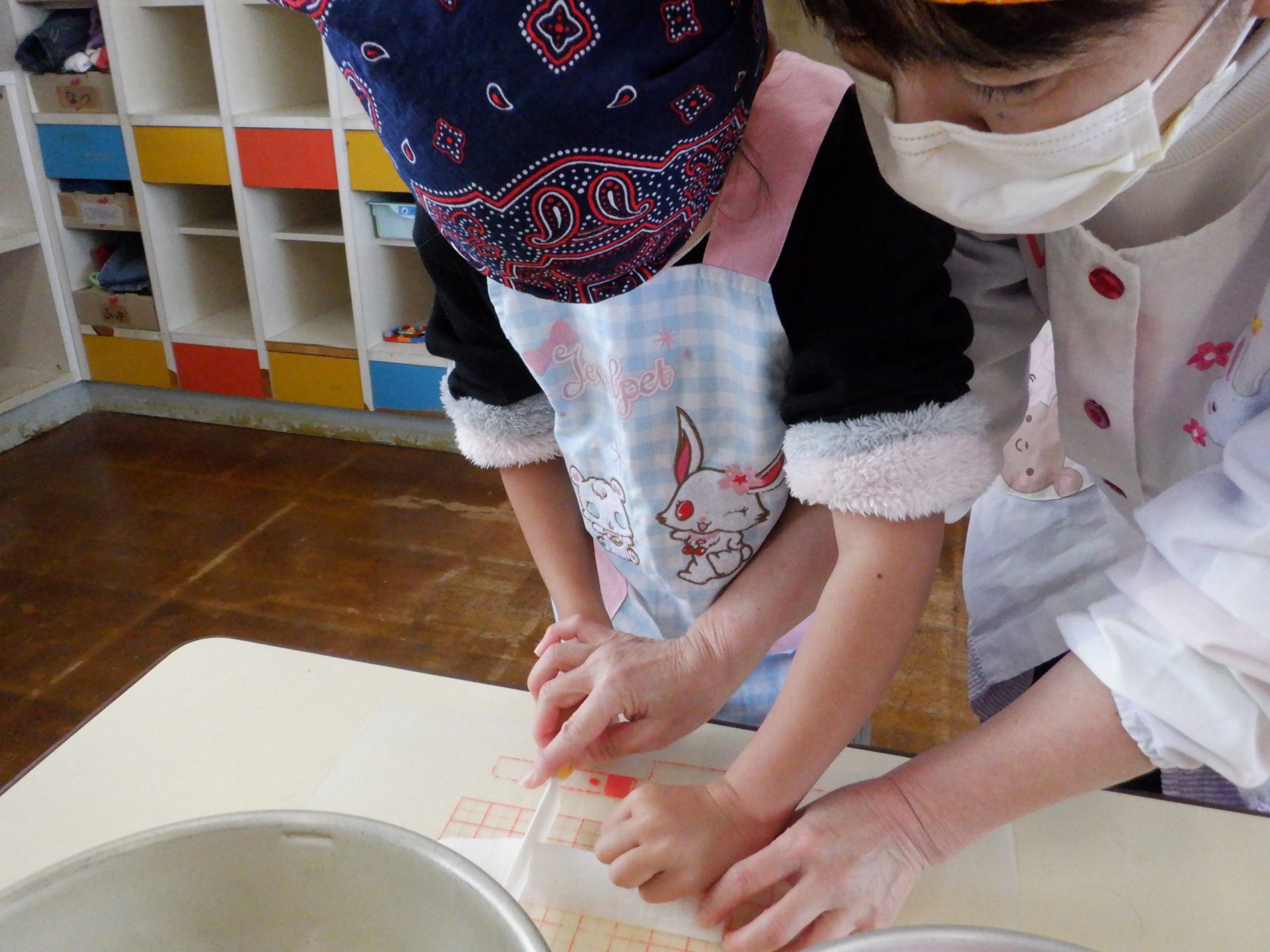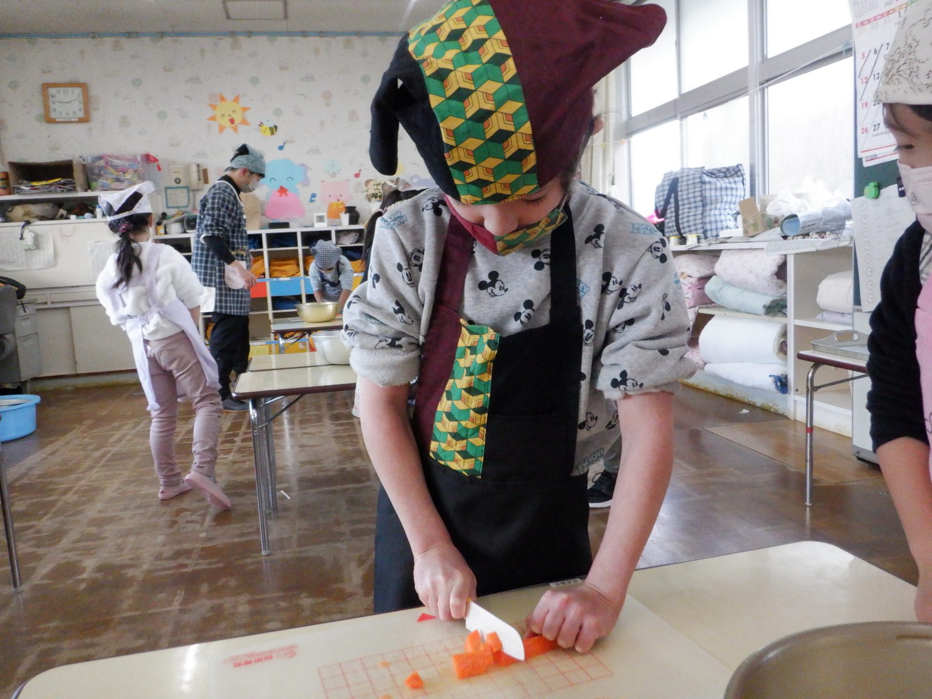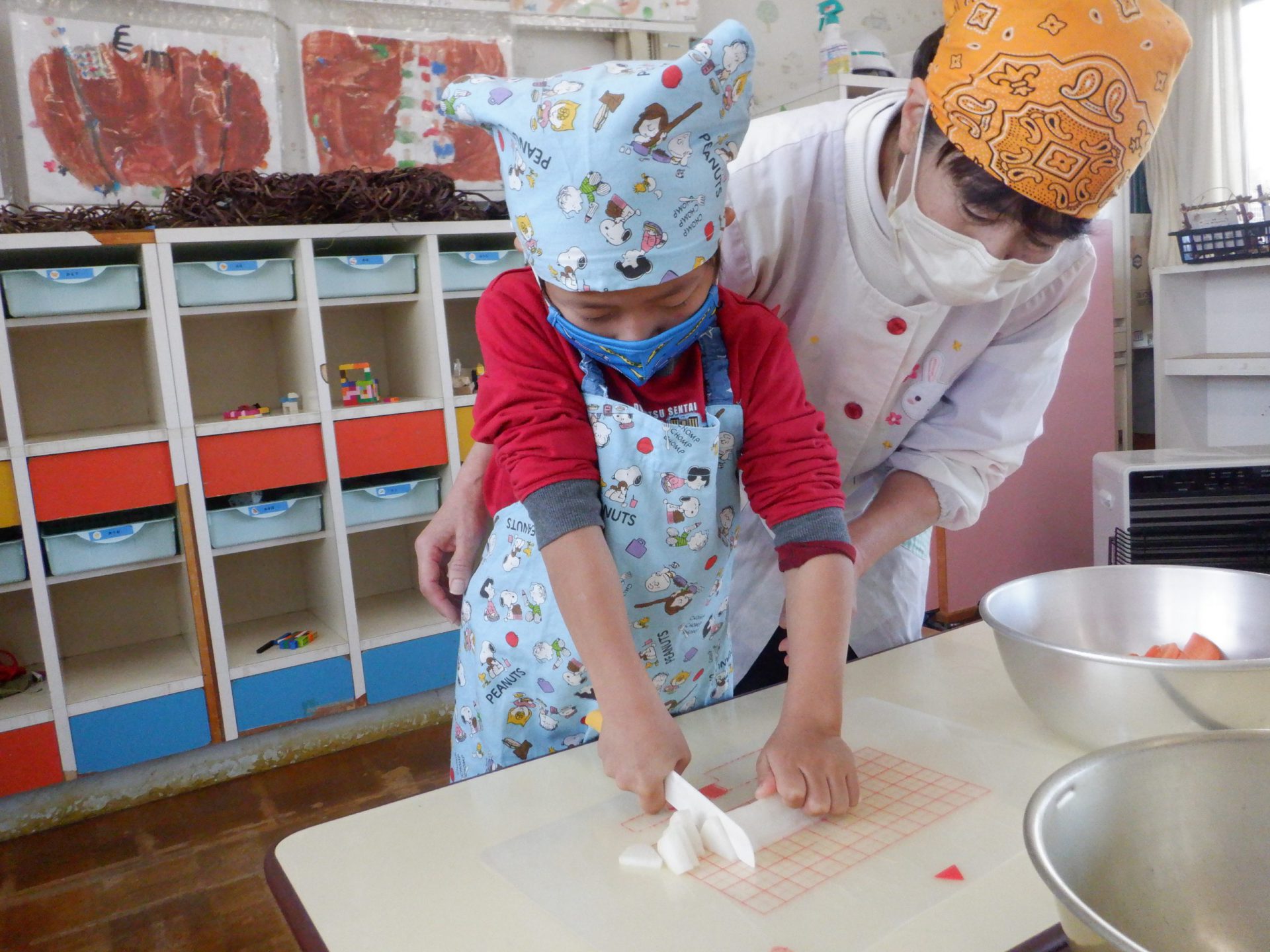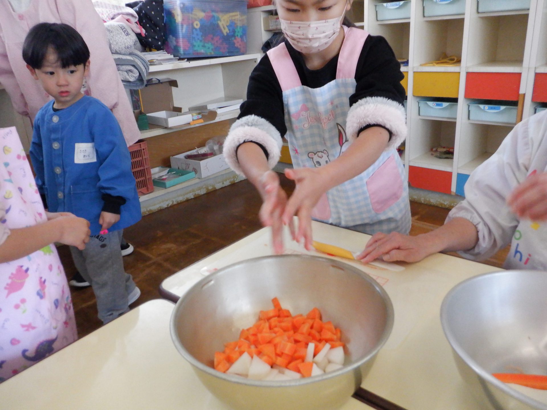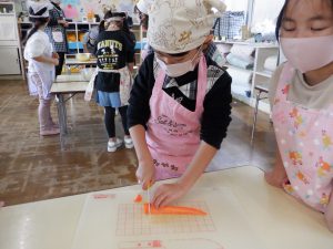 まずは年長さんが具だくさん汁に入れる人参と大根を切るクッキングをしました。