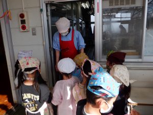 切った野菜を大事に運んで、給食先生に「汁に入れてください。」とお願いしました。