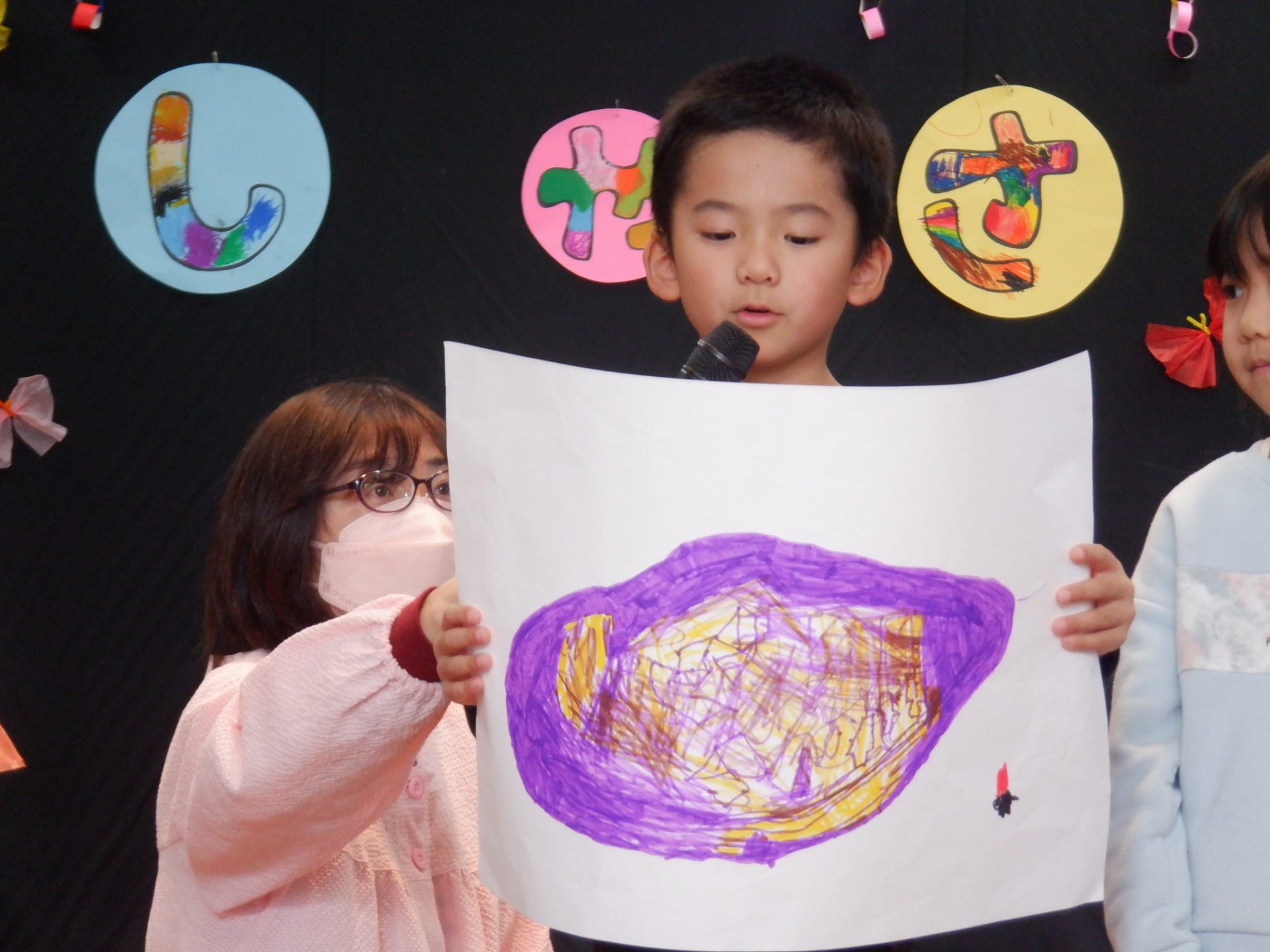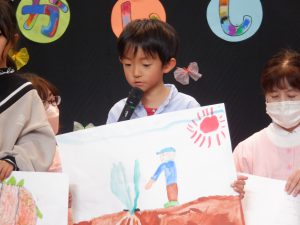 年長さんは畑の活動でがんばったことや収穫できてうれしかったことを絵に描いて発表しました。