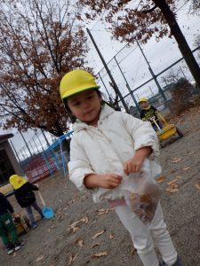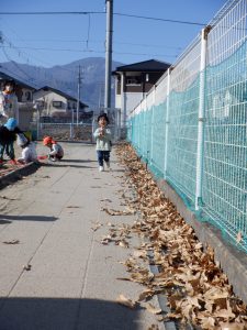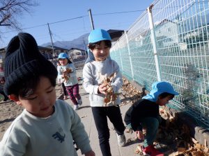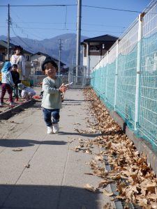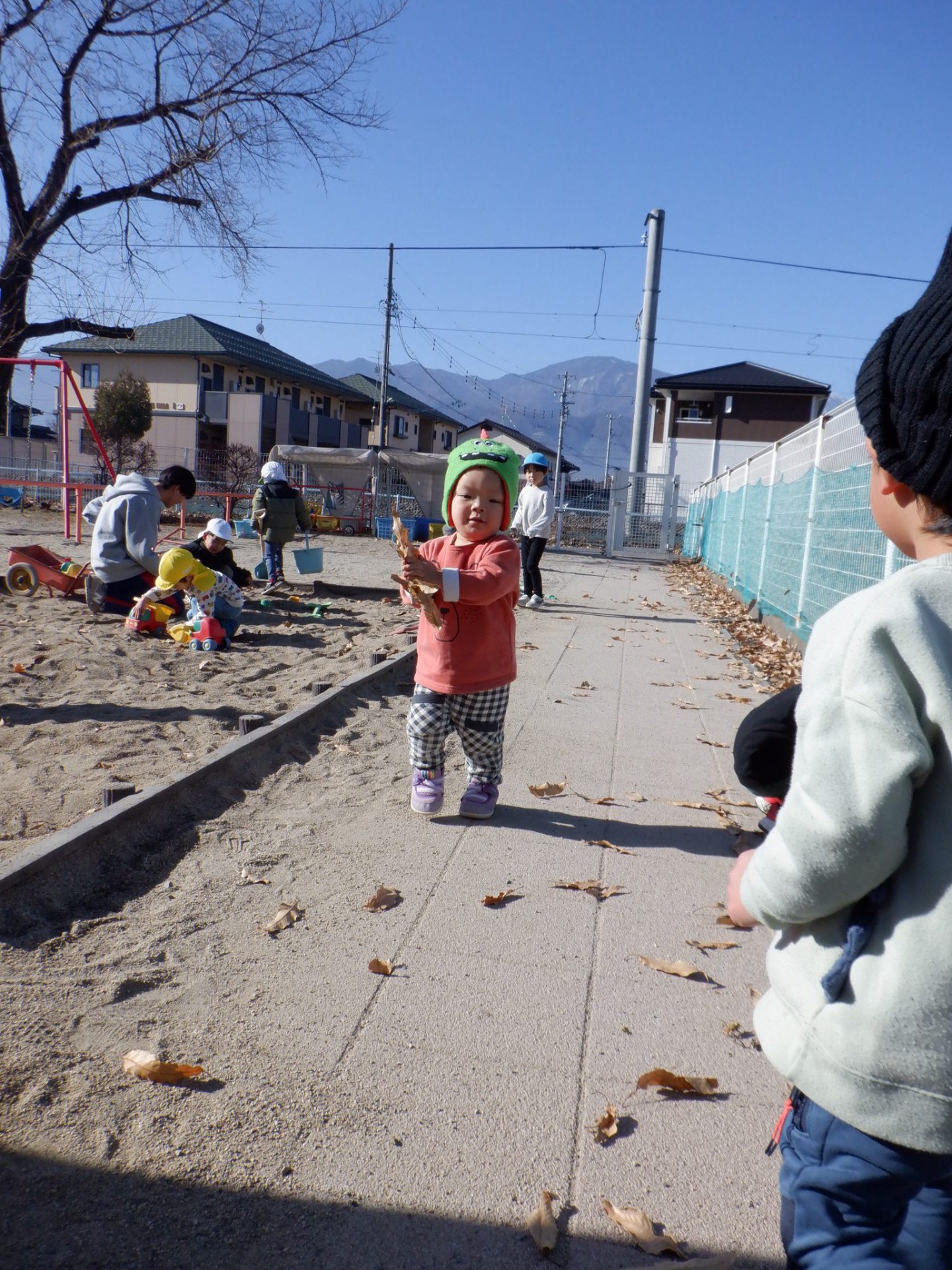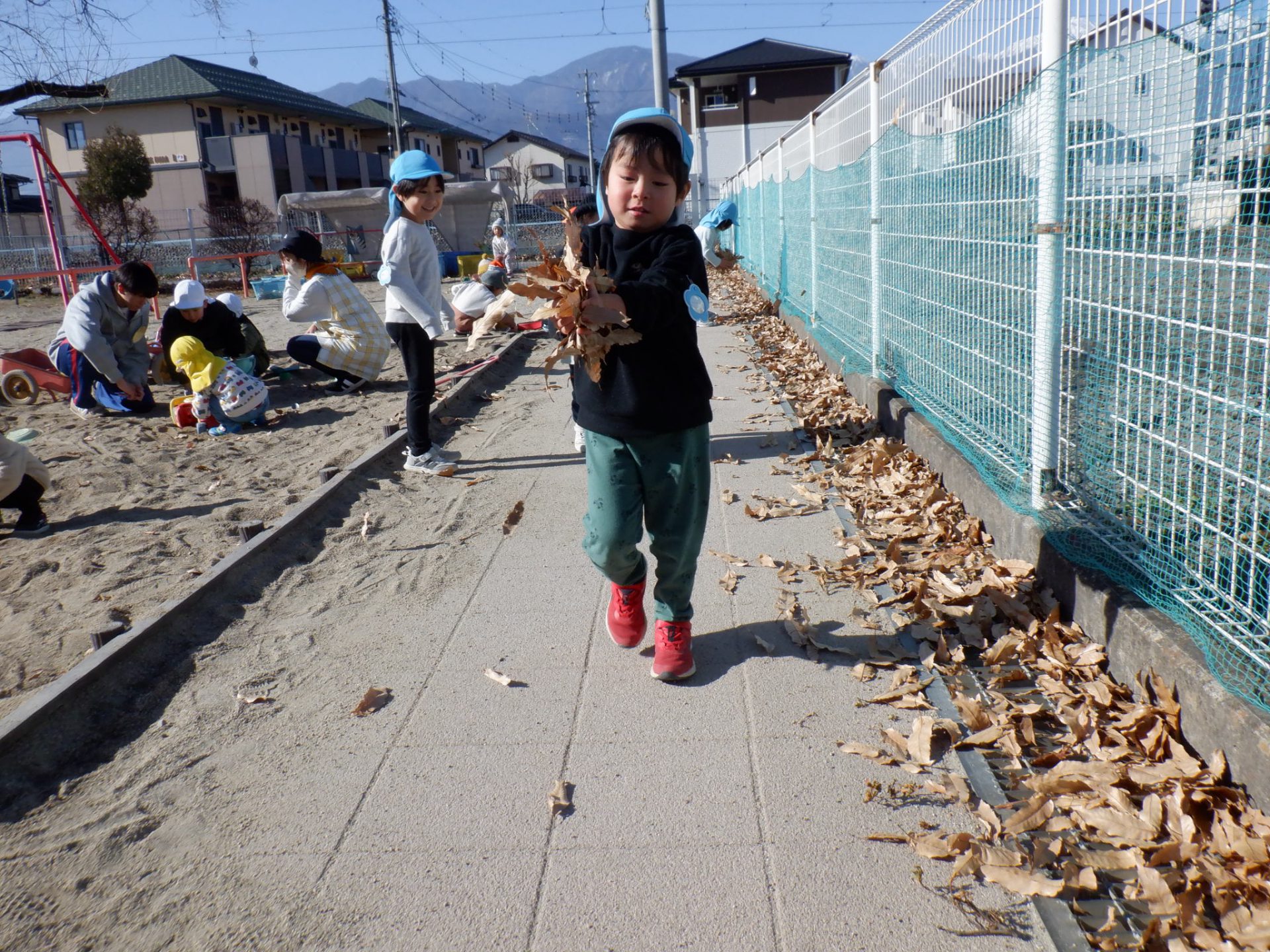 季節はすっかり冬。園庭は落ち葉でいっぱいです。大人にとってはやっかいな落ち葉ですが、子ども達にとっては宝物のようです。