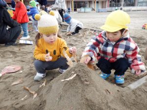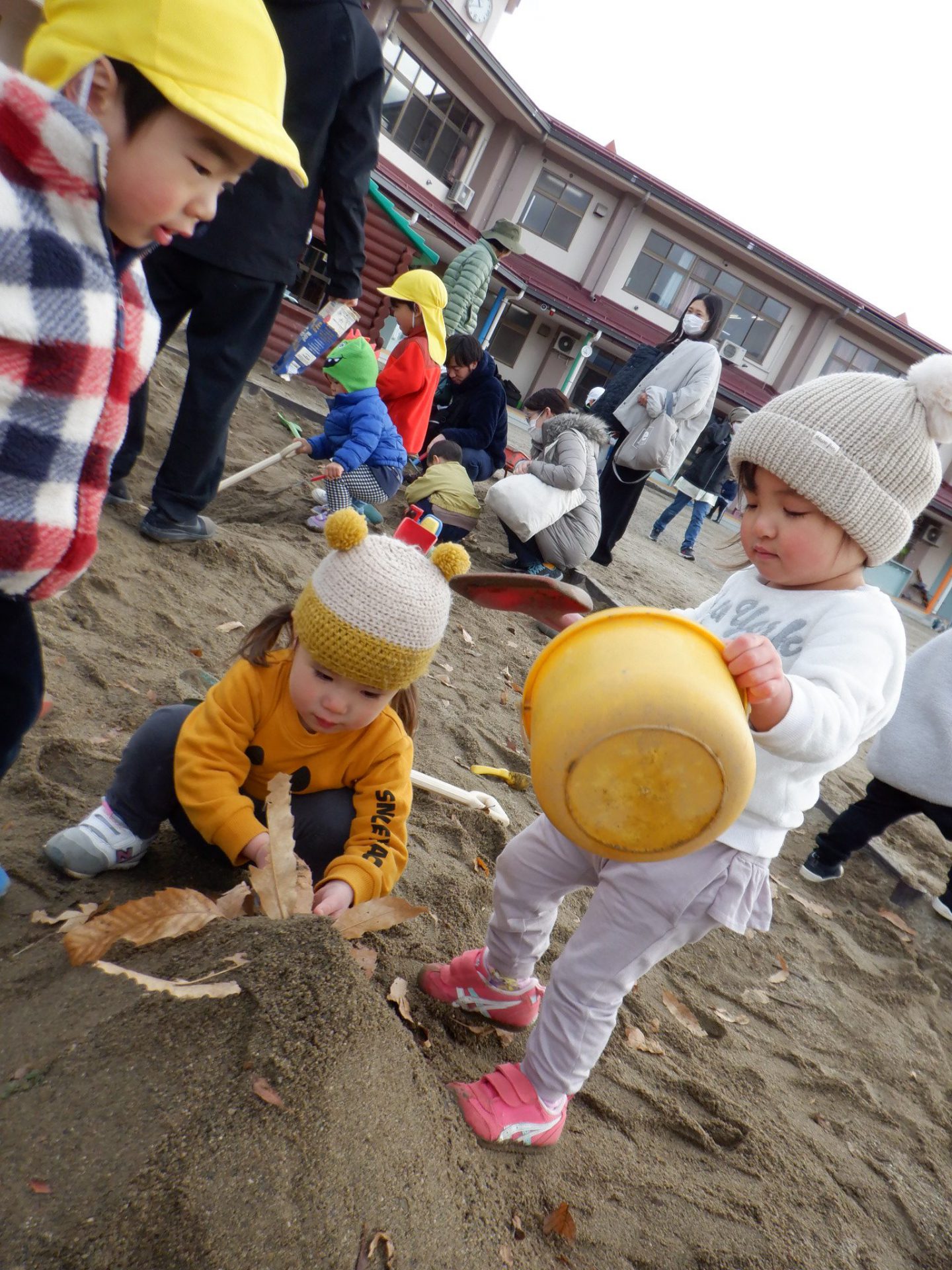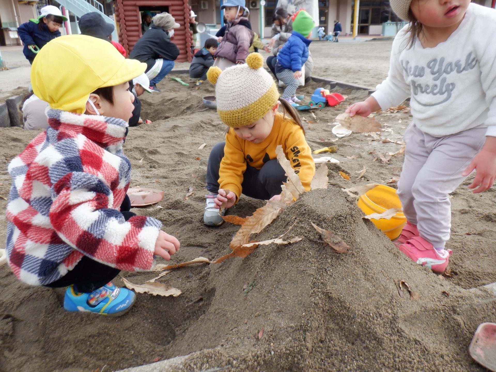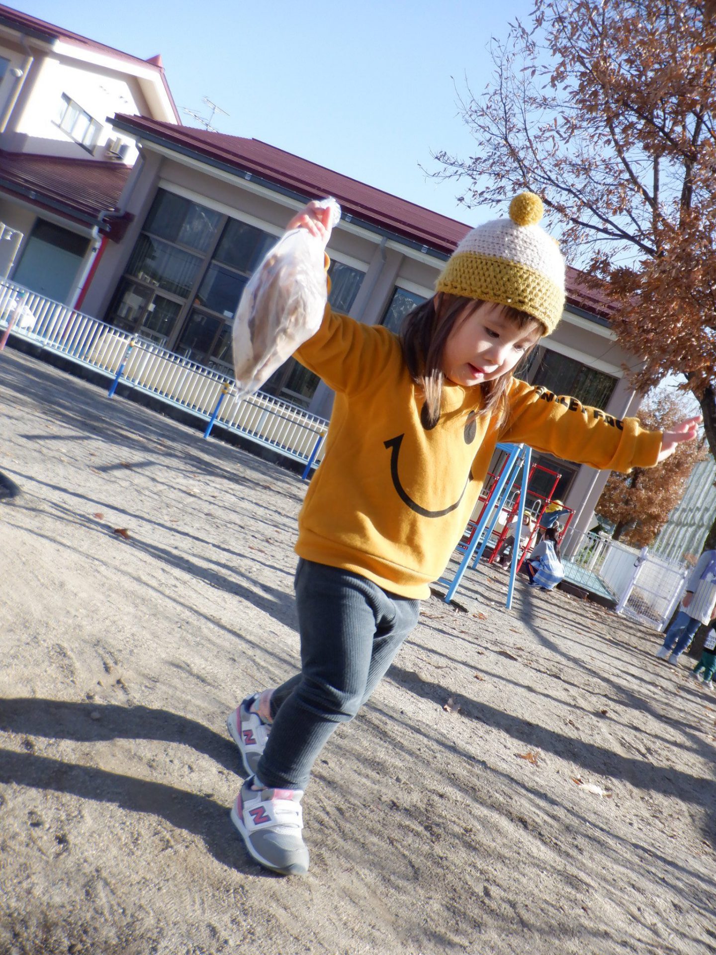 季節はすっかり冬。園庭は落ち葉でいっぱいです。大人にとってはやっかいな落ち葉ですが、子ども達にとっては宝物のようです。