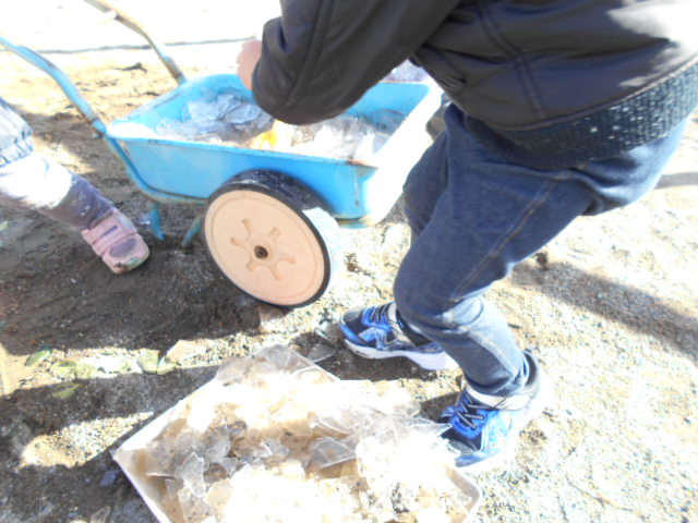 氷が冷たくて手で持てない子も自ら持ってきた虫取り網や手押し車に乗せて、氷を運んでいました。