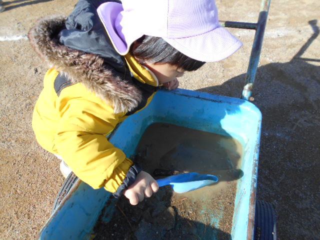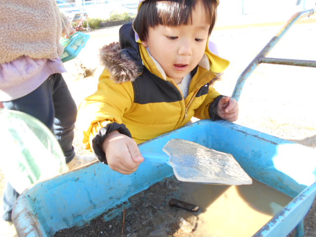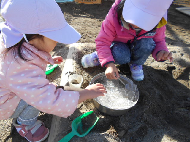 ・ただ氷に触れるだけでなく、氷を集めて運んだり料理ごっこにしたりと氷を使った遊びも楽しむ姿が見られました。