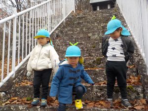 前日の雨で路面が濡れていて登りよりも下るときの方が大変なことに気づいた子ども達です。