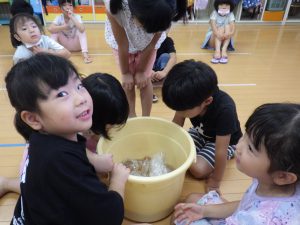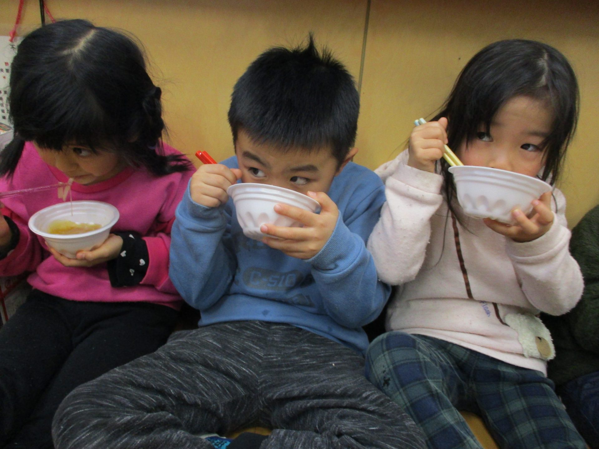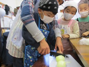 枝豆を栽培して大豆にし、味噌になるまでの過程を学びました。年中から年長までの月日を経過し、これだけの時間を経て味噌が完成することを知りました。長い期間待っていただけあり、食べた瞬間はとても嬉しそうな表情を浮かべていました。地域の方との交流を通して昔ながらの味噌作りを体験し、食への興味関心が更に深まってくれるといいなと思います。