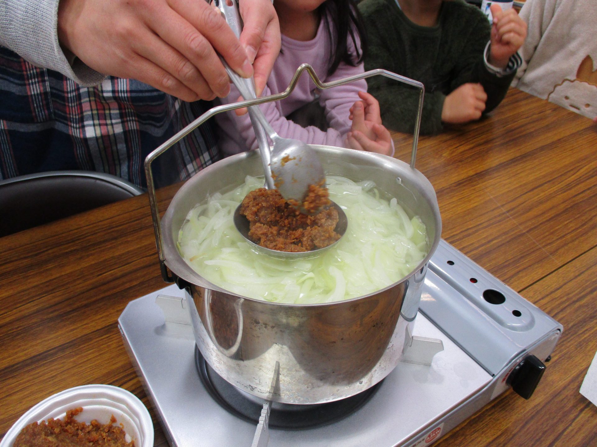 昨年度、年中の時に枝豆を栽培し、乾燥させた大豆を使い地域の方に教えて頂きながら味噌作りをしました。年長になり運動会が終わった頃、完成を楽しみにしていました。いよいよ味噌が出来上がり、みんなで味噌汁を作り、味わってみることにしました。