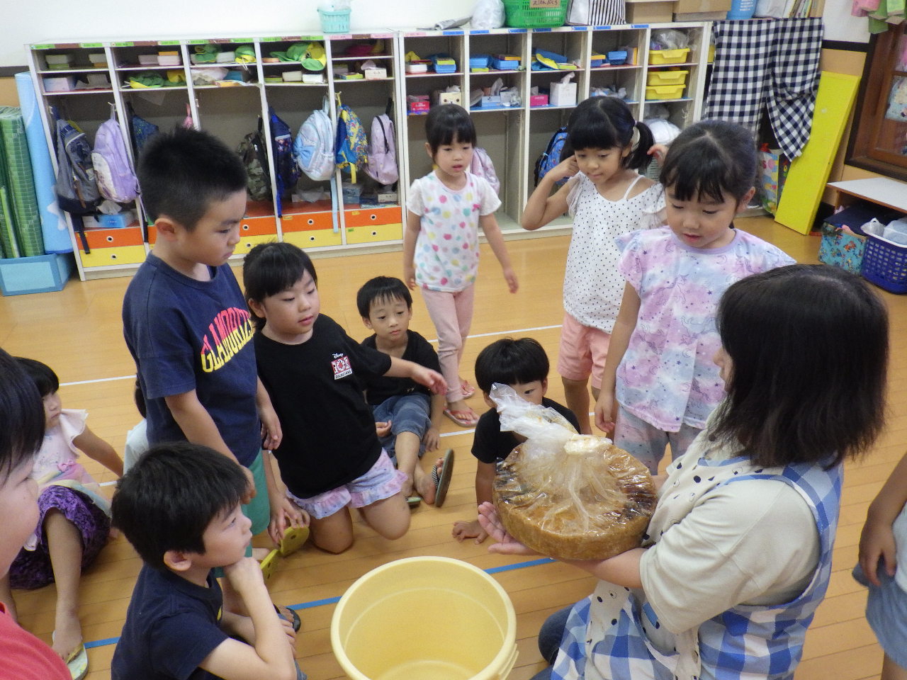 保育士「上と下の味噌が同じように熟成して、おいしくなるようにひっくり返すんだよ。」