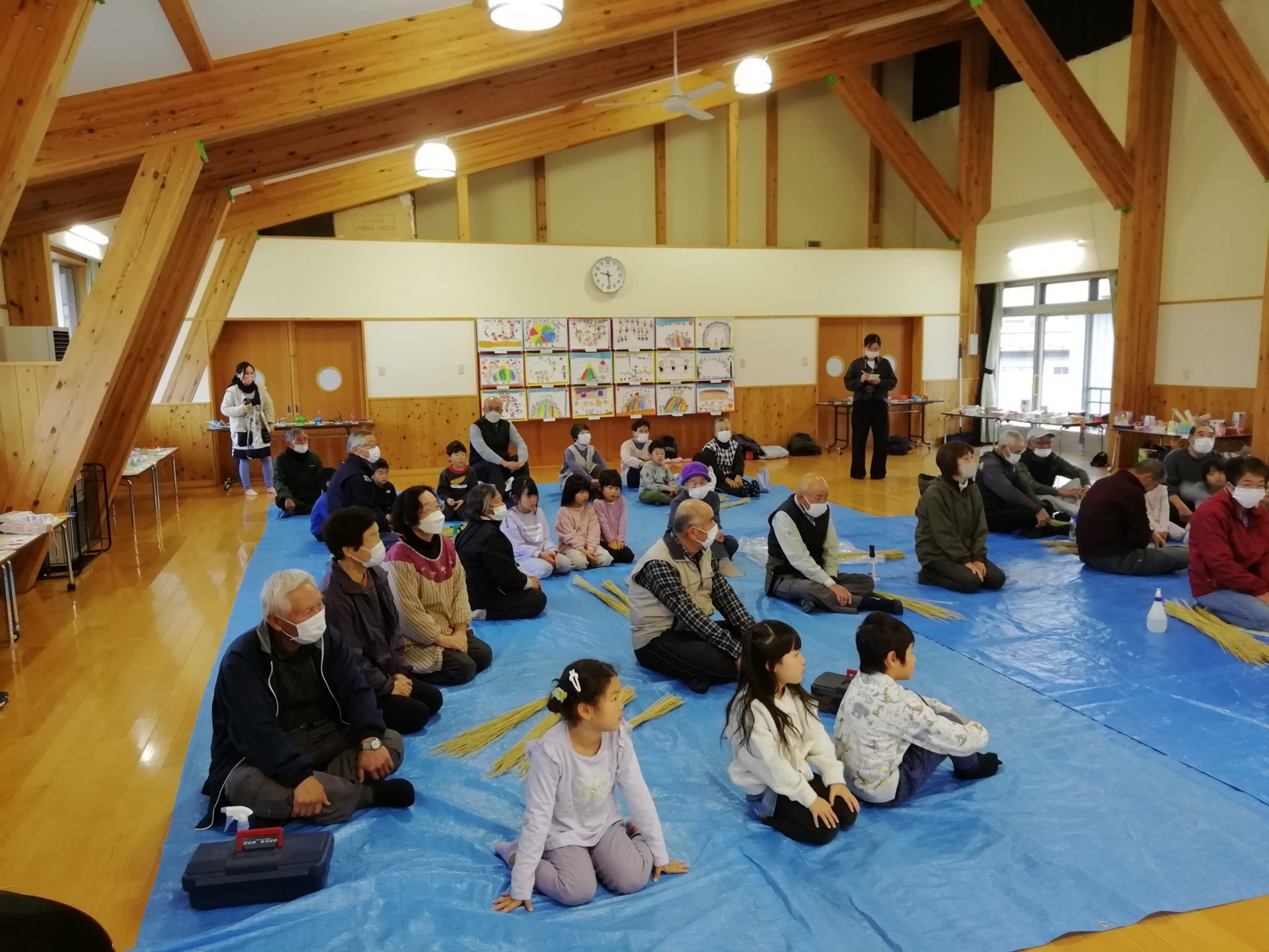 地域の老人クラブの方や、社会福祉協議会の方から藁についてのお話を聞き、藁はみんなの食べているお米が実る稲からできていることを教えてもらいました。