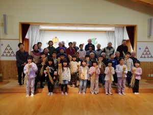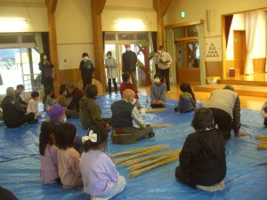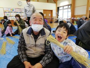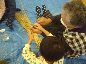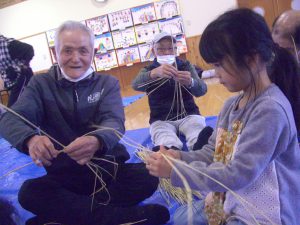 お年寄りの方に教えてもらいながら子どもたちも藁を編んでいきます。