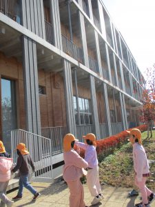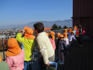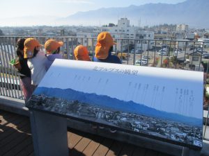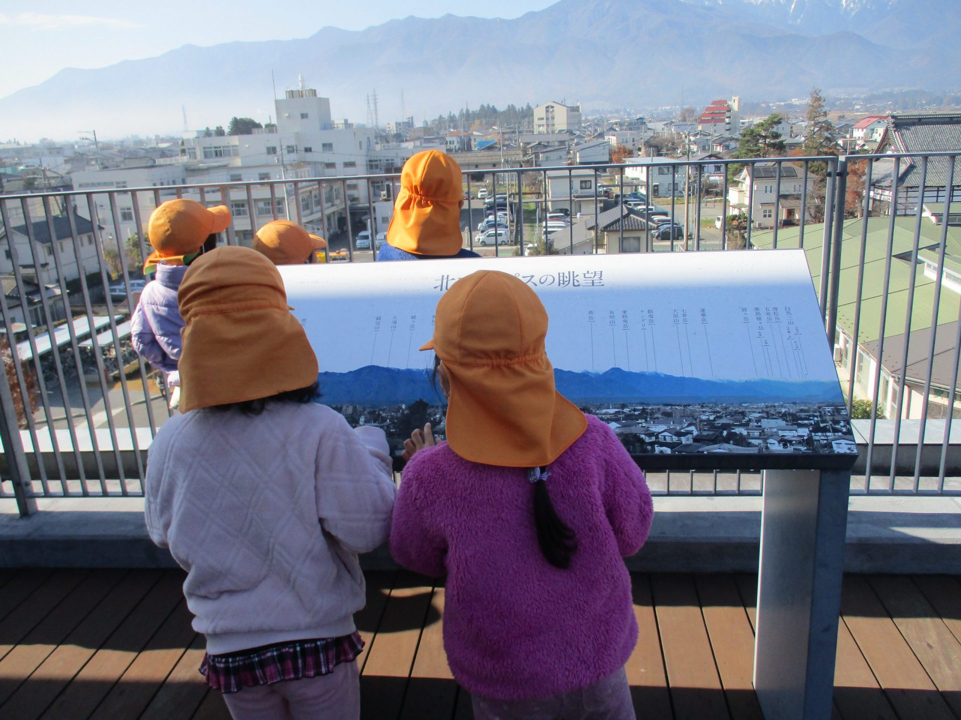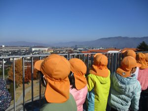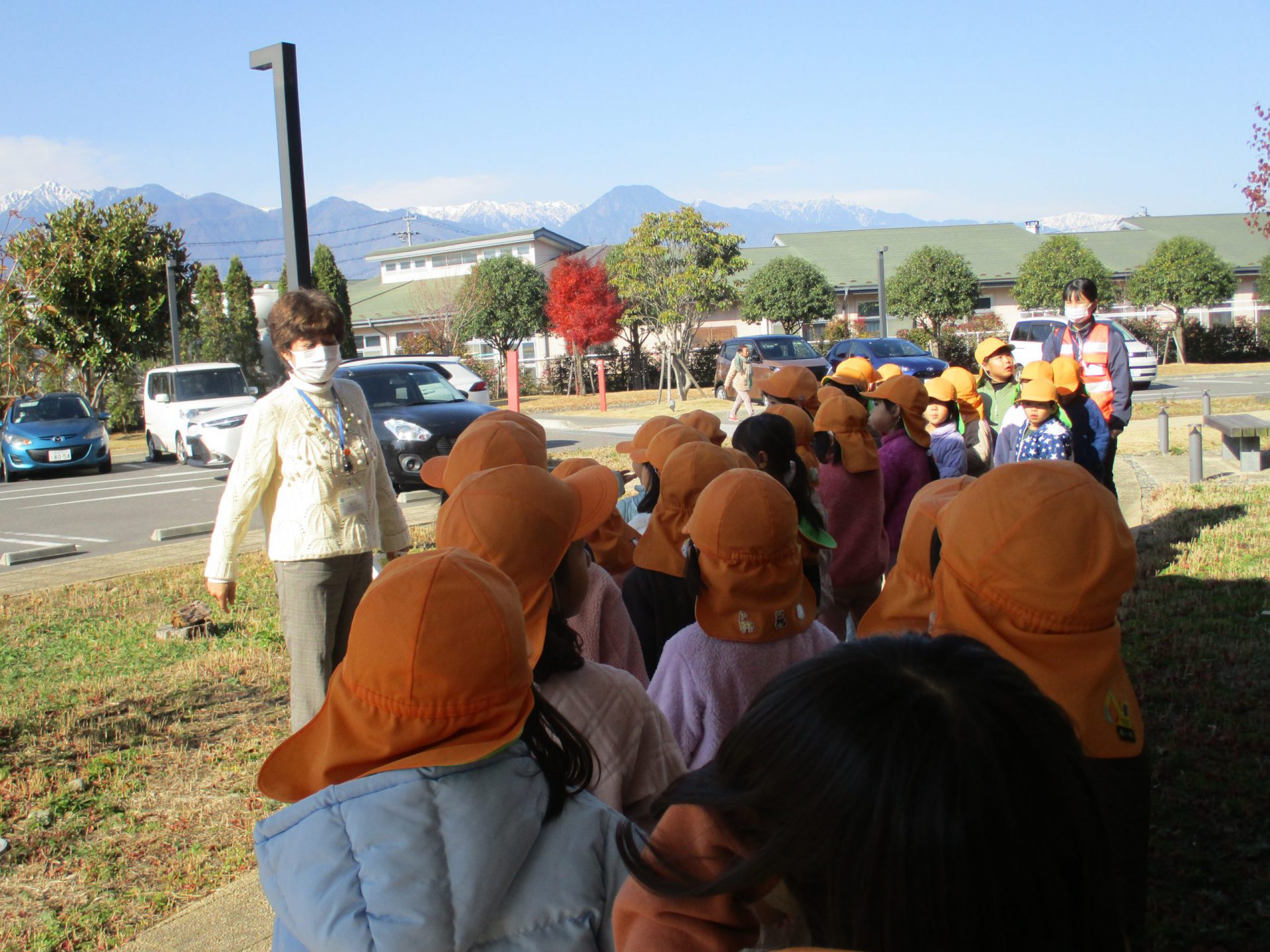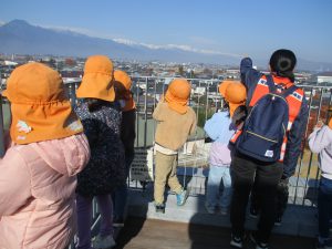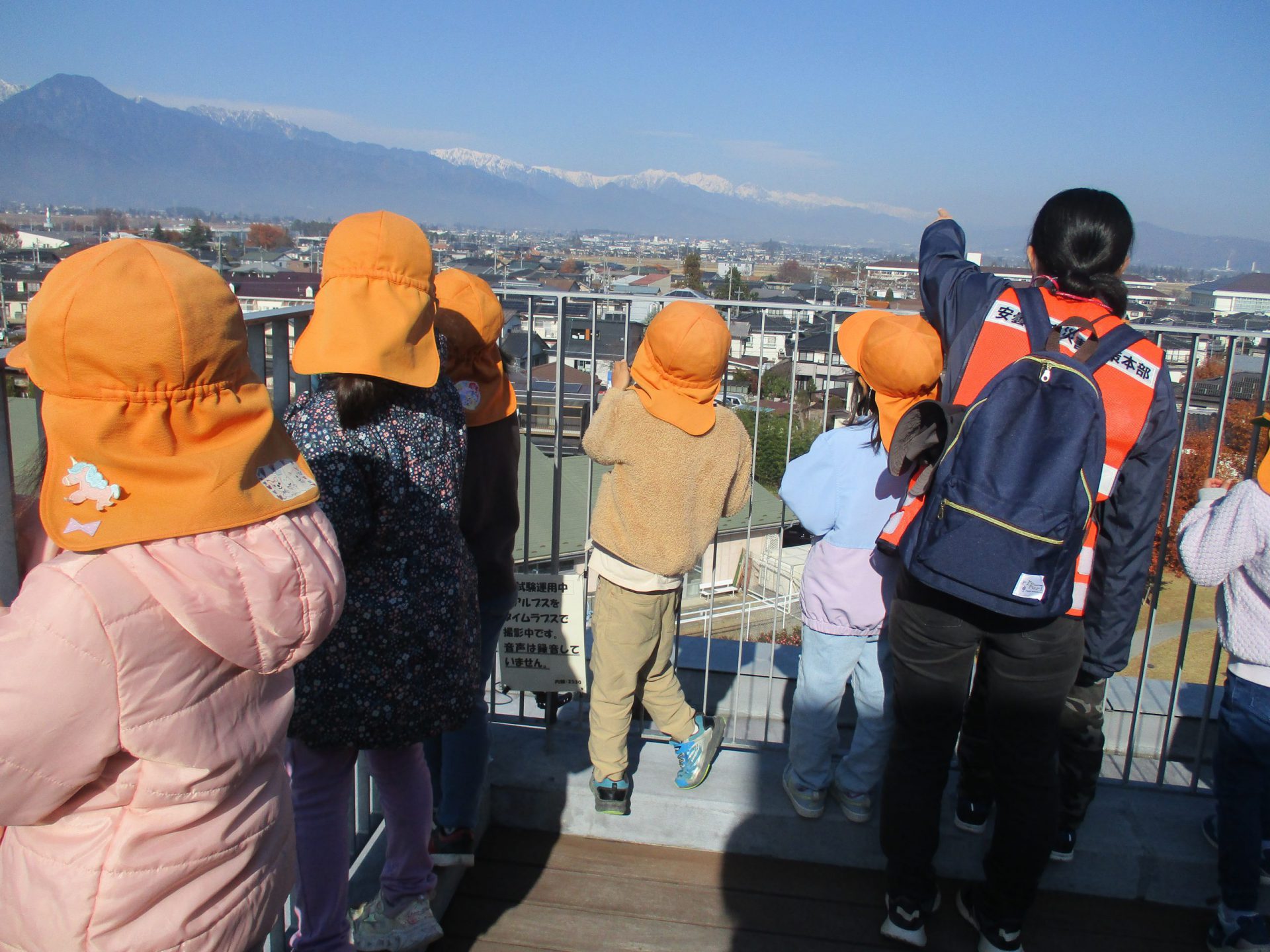こども園の園庭から見える安曇野市役所。「昨日お母さんと市役所に行ってきたよ」「うちのお父さん働いてるよ」「前の園長先生がお仕事してるんだよね」と子どもたちが気になっていた安曇野市役所へお散歩に行ってきました。