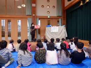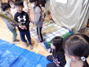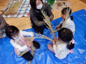 まずは、どうしてお正月にはしめ縄を飾るのか、しめ縄にも色々な形があるということを絵本を通して教えてくれました。