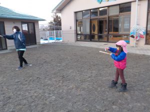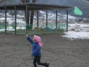 ・凧あげや羽根つきを楽しみながら「ぼく、お餅食べたよ」「みんなでお出かけしたんだよ」等、お正月の出来事を話す良い機会にもなっています。この時期ならではの遊びを思い切り楽しんでほしいと思います。