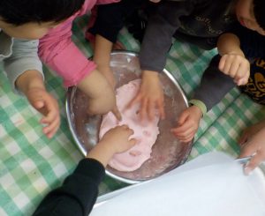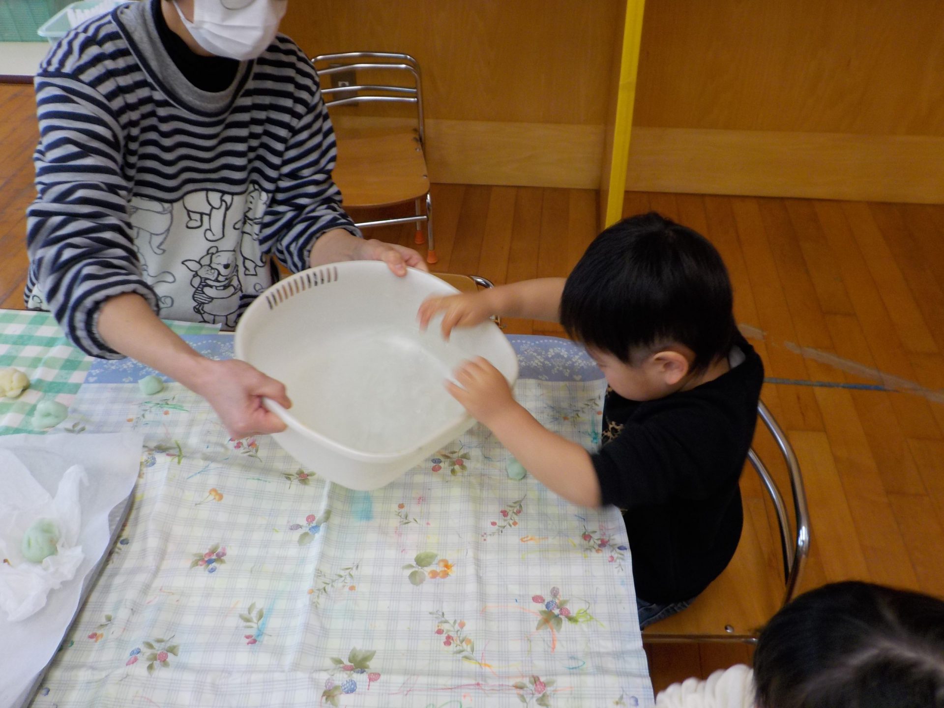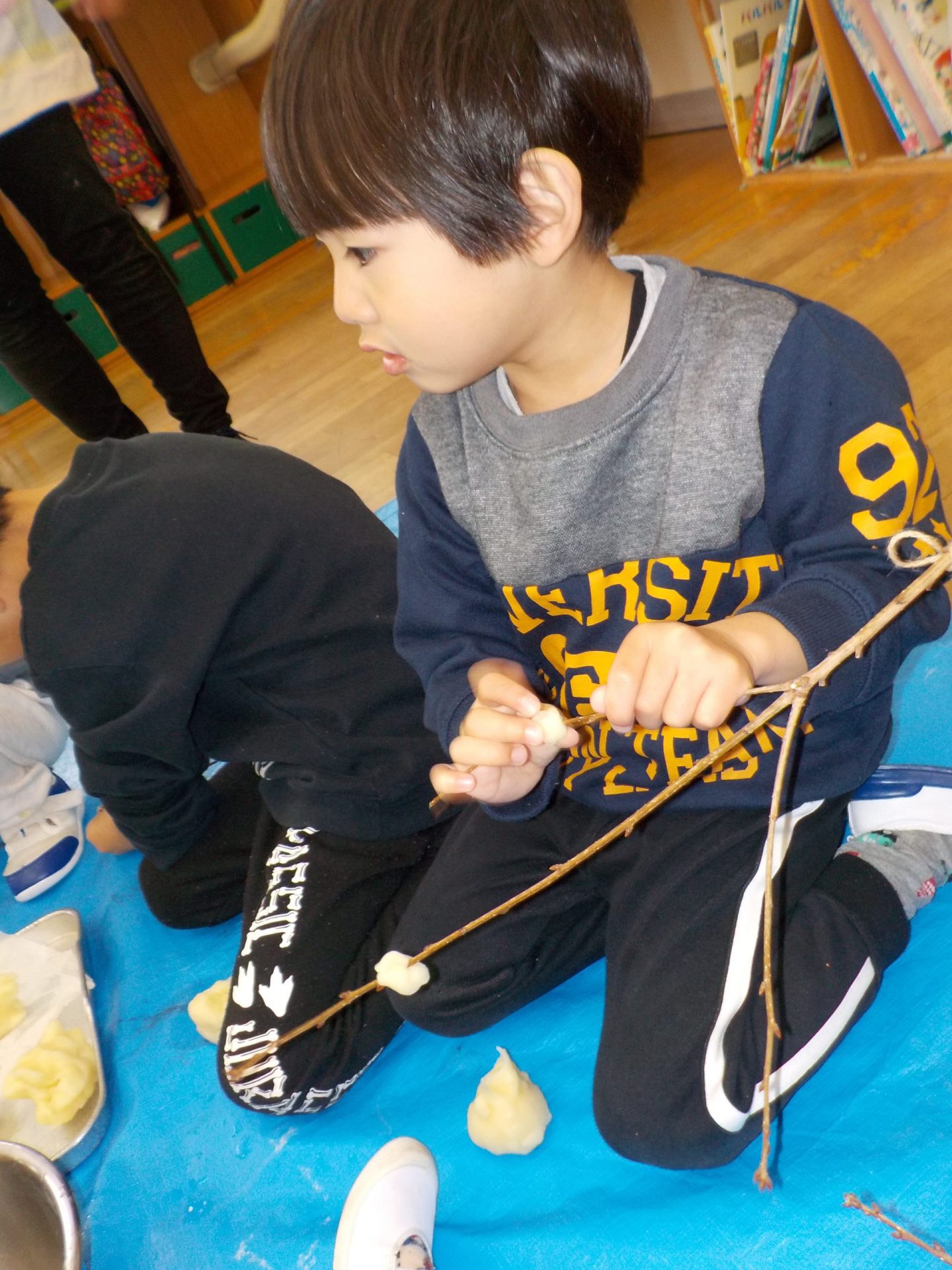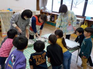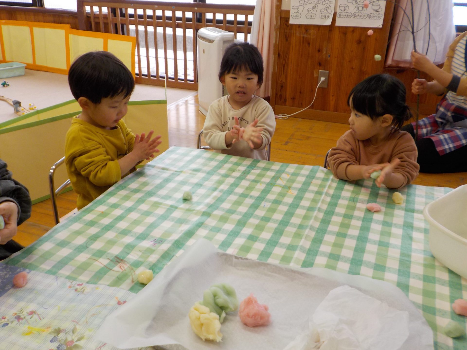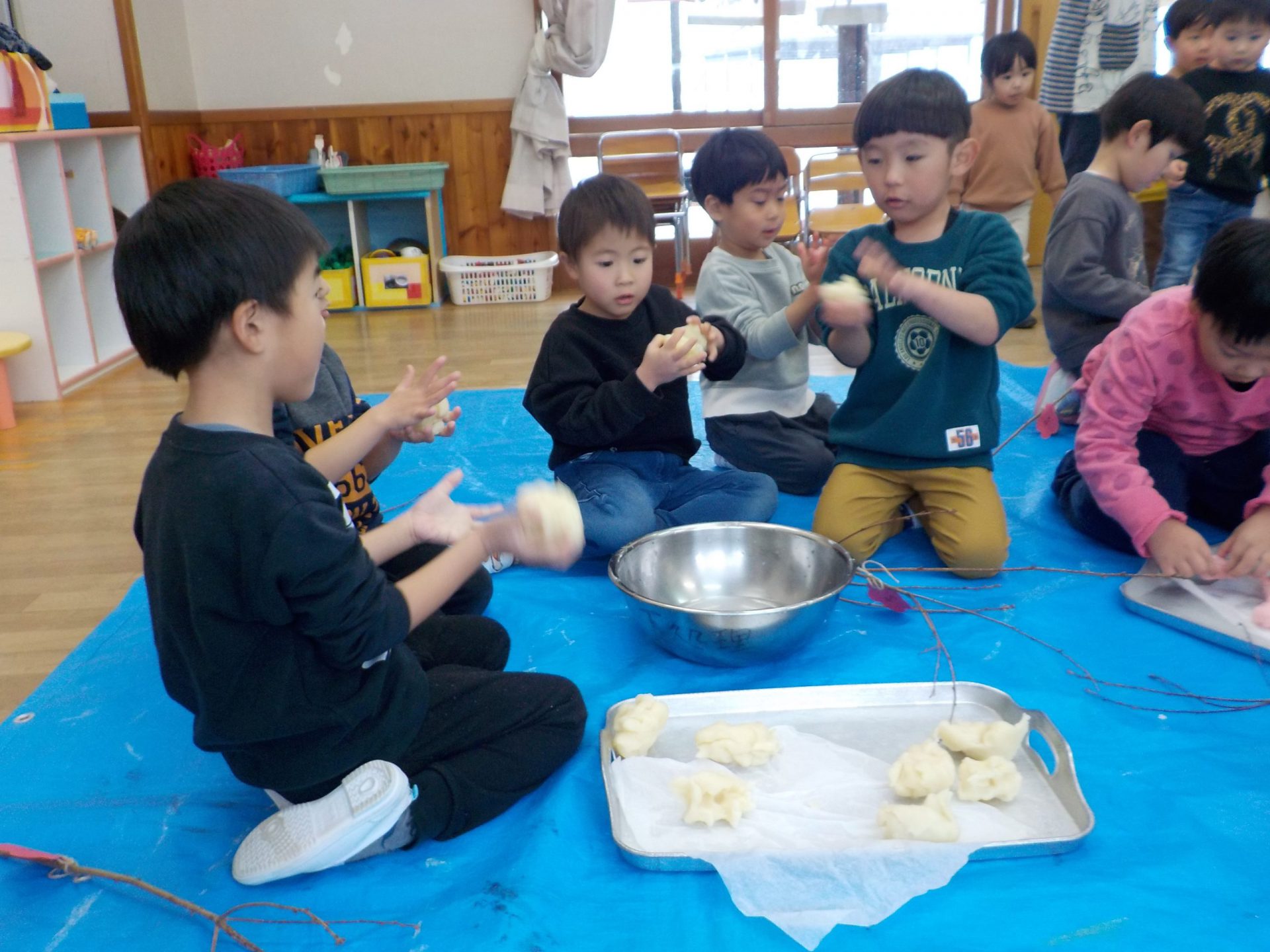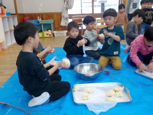保育士が「熱い!熱い!」と言いながらこねています。