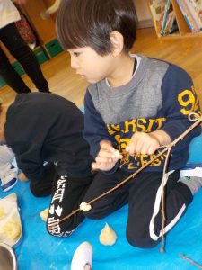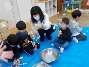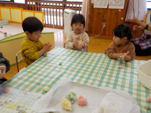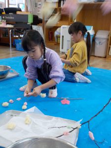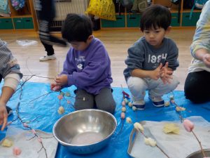 ・日本の伝統行事を知ると同時に、米粉の生地の柔らかさや香りを感じる、ふかす前と後の色の違いに気付く、生地をちぎる、丸める、枝から落ちないようにつけるにはどうすればいいか考える、等、五感を使って体験することができました。