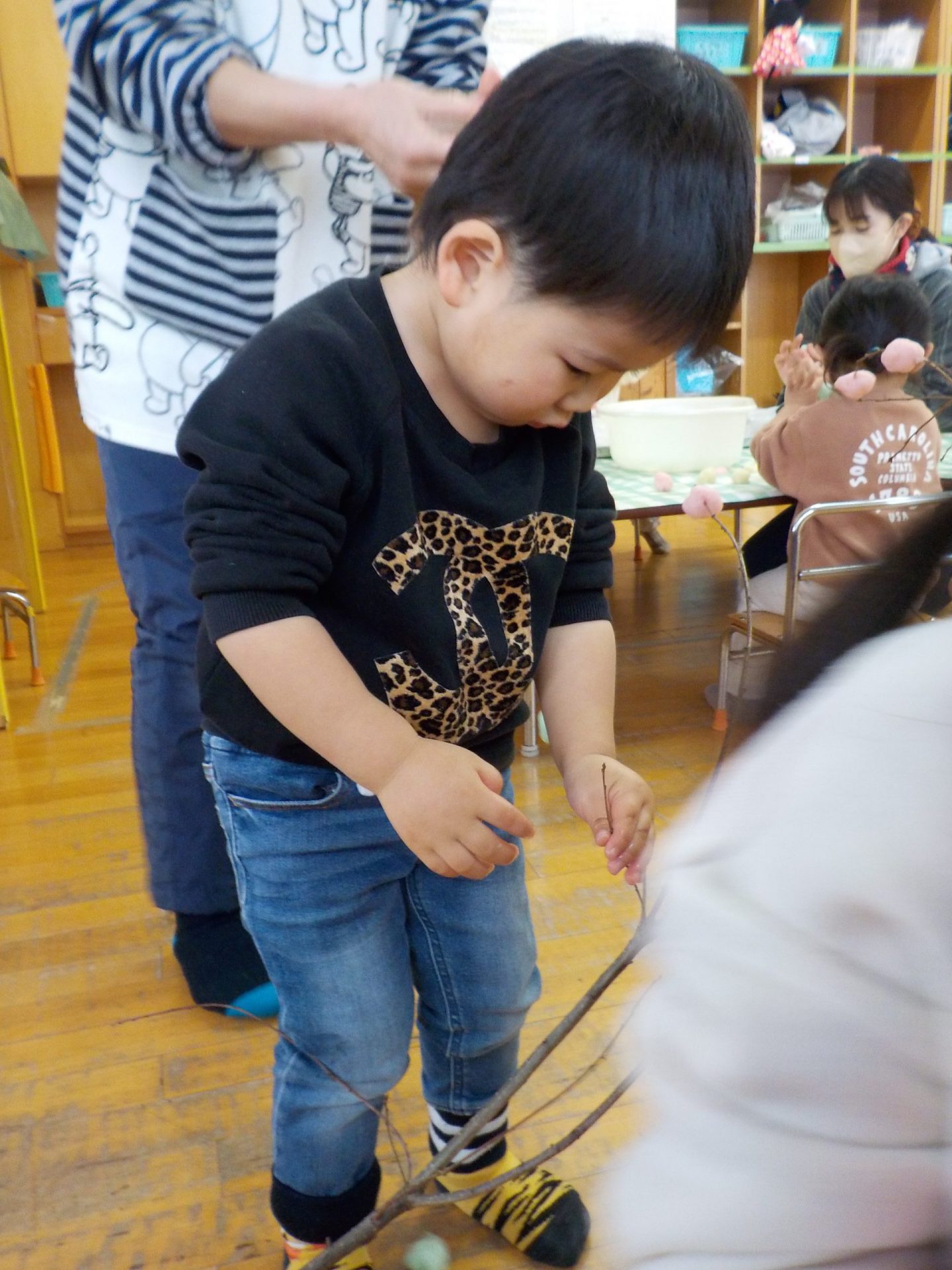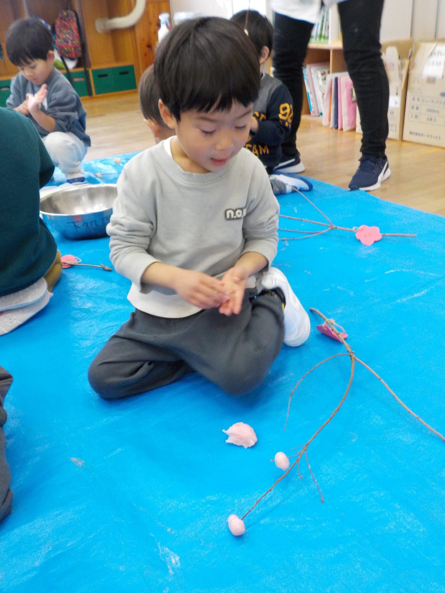 「ベタベタする~」「コロコロ丸くしよう」「どうやったら枝に付くかな」