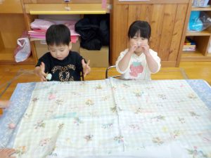 2歳児さんは「どこにつけようかな」