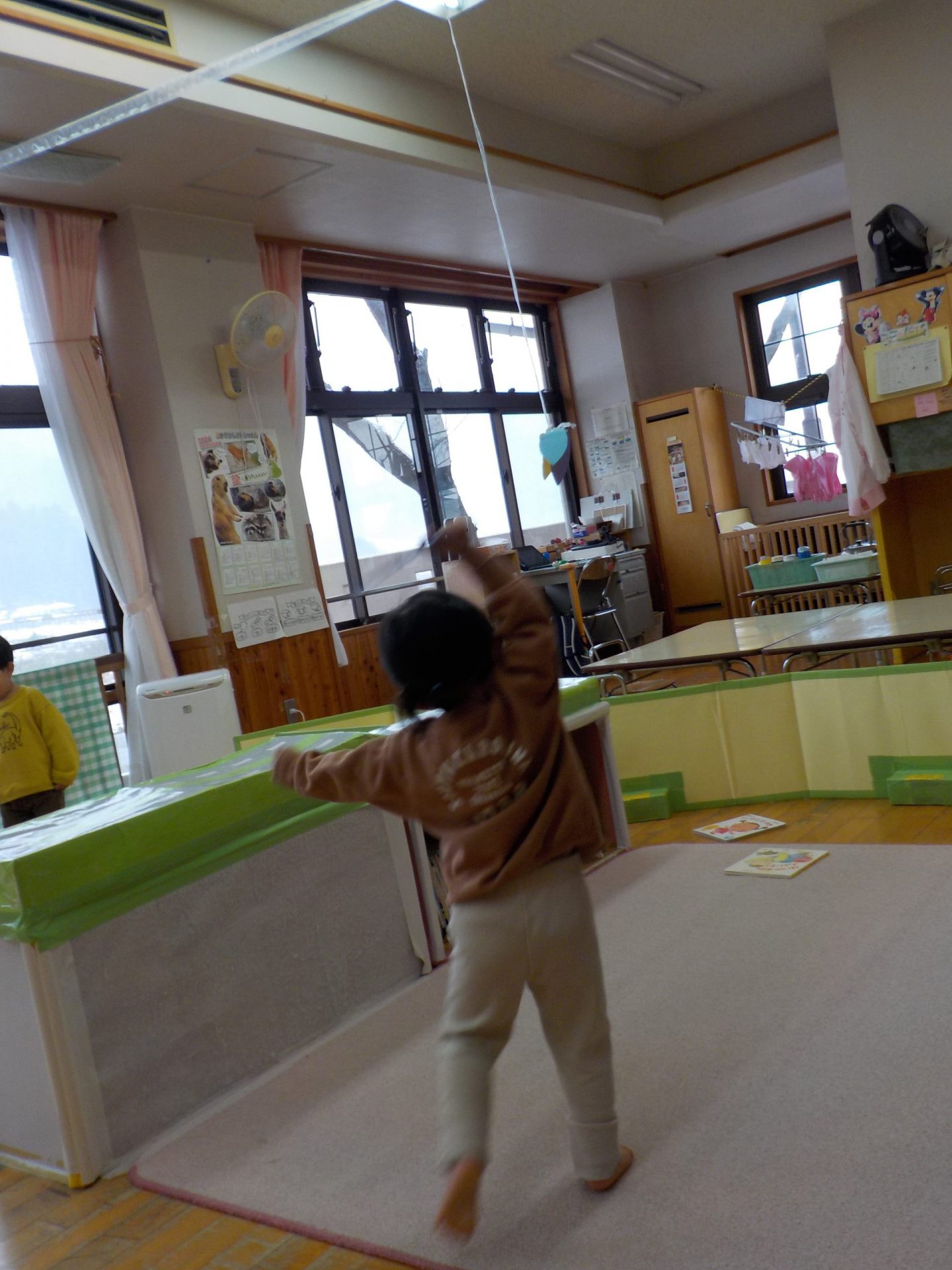 保育室に、保育士お手製の羽根をぶら下げて、段ボール羽子板で羽根つきごっこ。