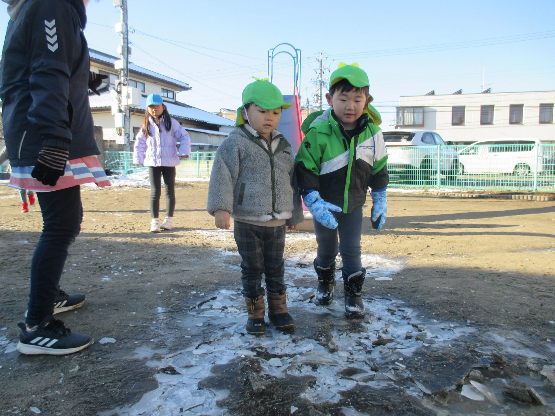 園庭に出た子ども達は氷の上を滑ってみたり、