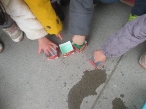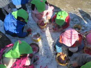雪はすぐに溶けてきましたが、少し残っていた雪を見つけた子ども達は「雪集めよう」とバケツを手にして集め回っていました。