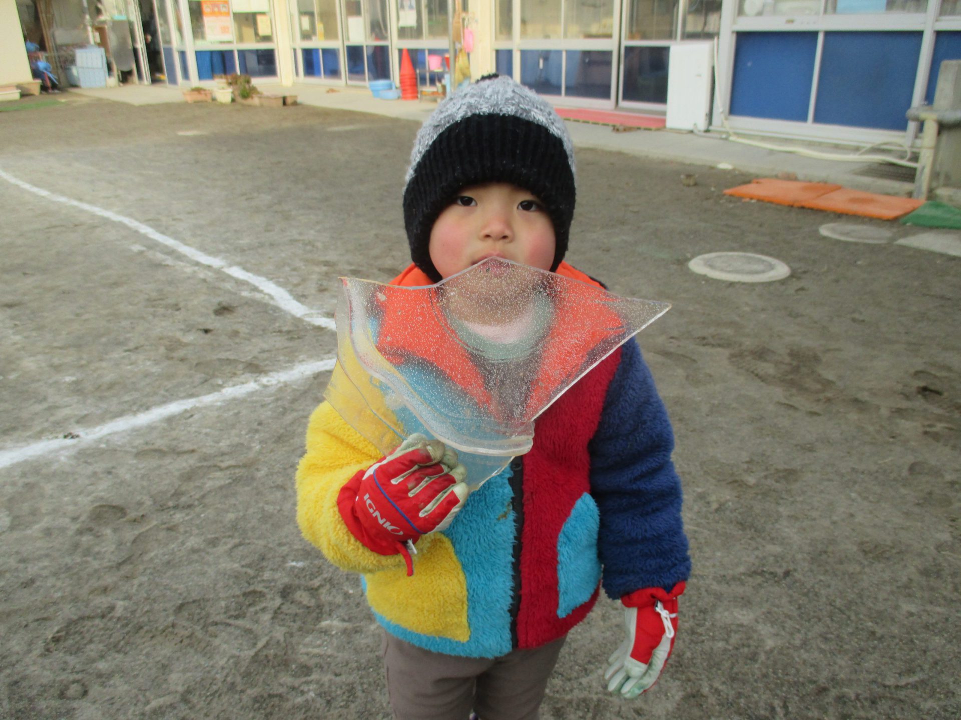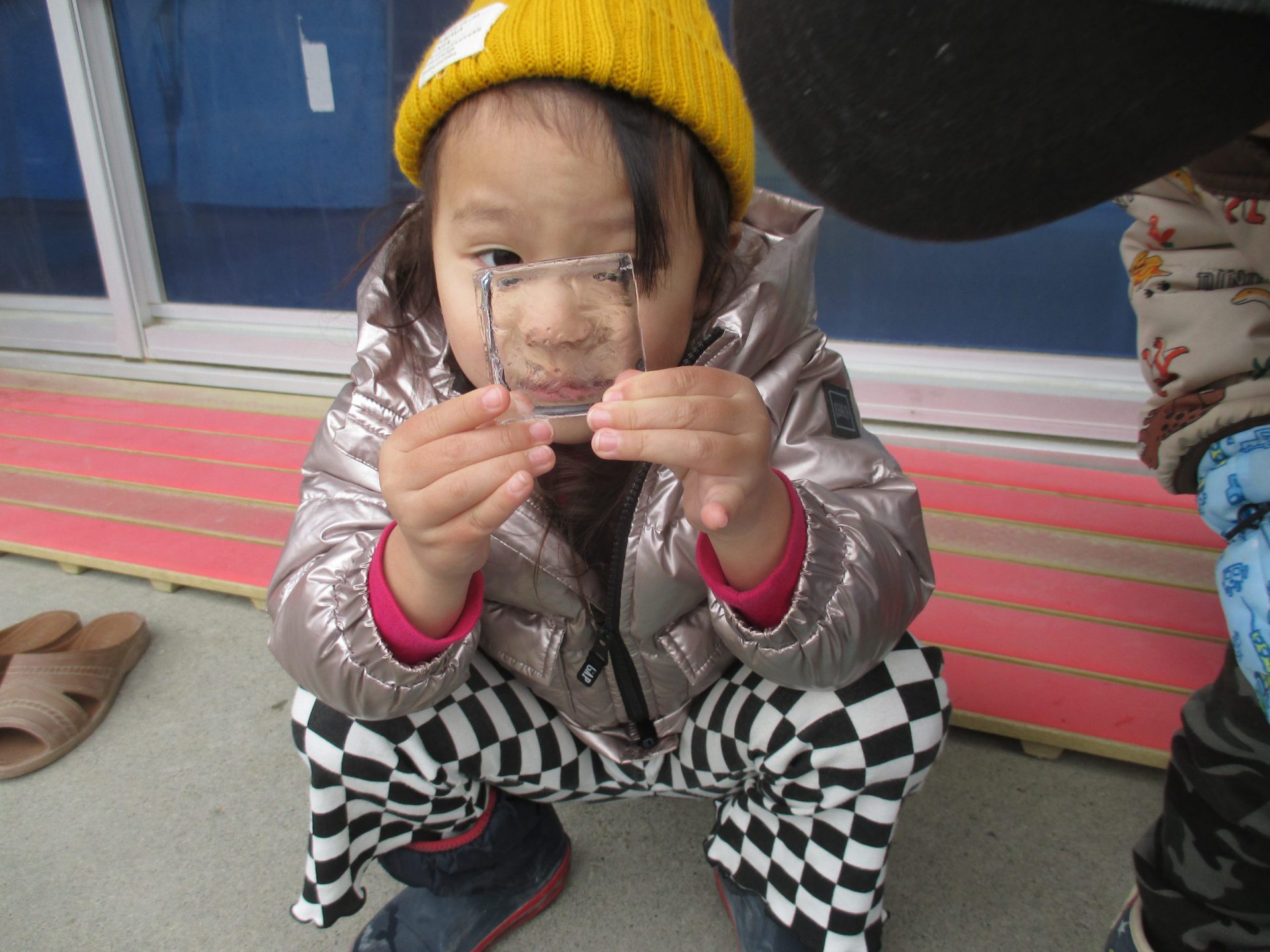 氷を顔の前の持ってきて「鏡みたい」と友だち同士のぞき込んでいました。
