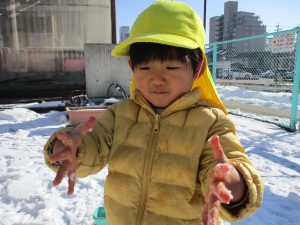 「冷たい!」と言いながらも何度も触って冷たさを楽しんだり、指で摘まんだ雪が溶けてなくなるのを「ない!」と言って不思議そうに見たりして発見がたくさんありました。