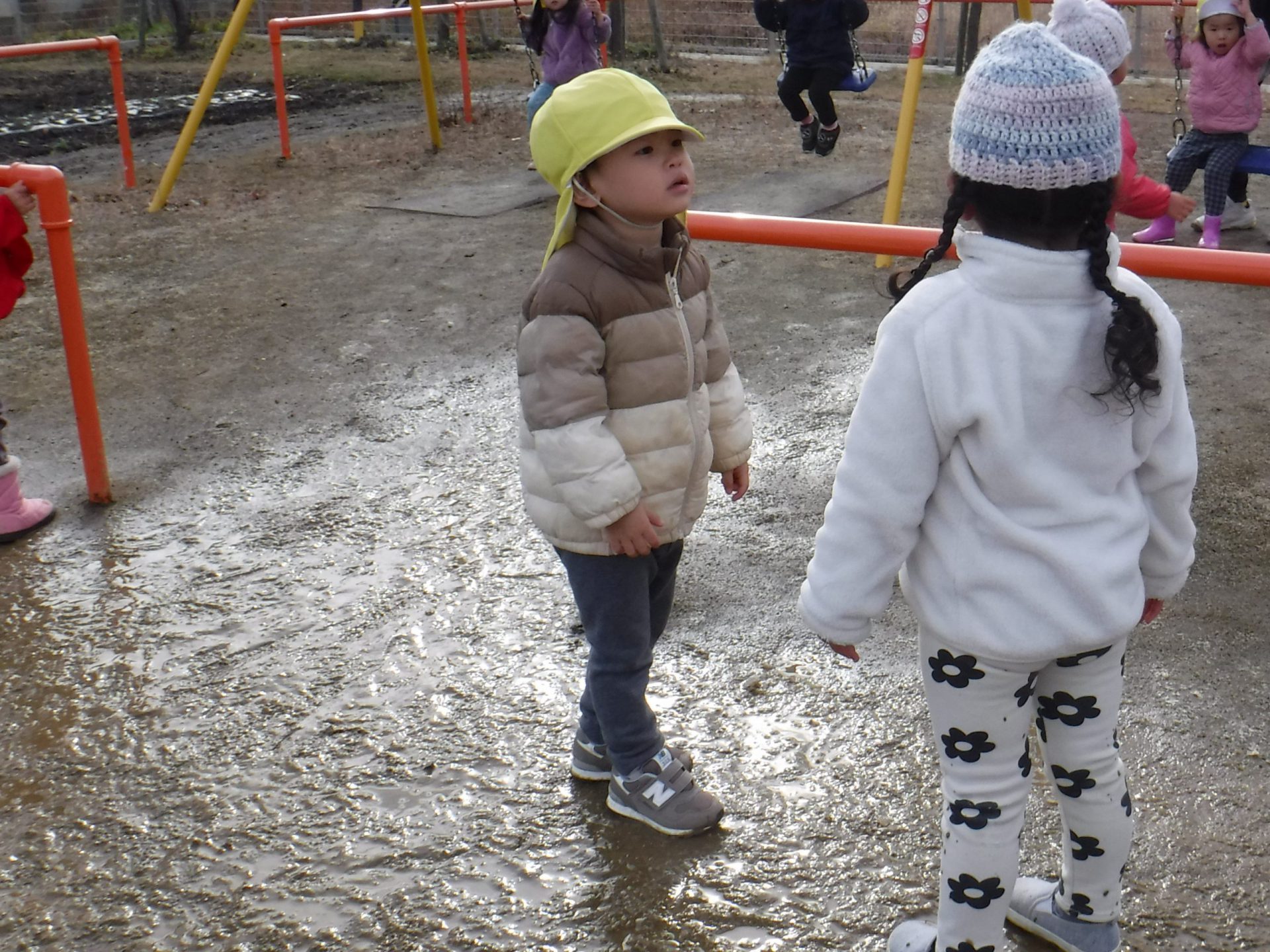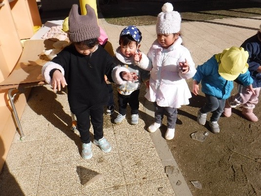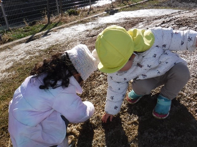 子ども達はいつものようにお外に出ると、霜柱と氷を発見!