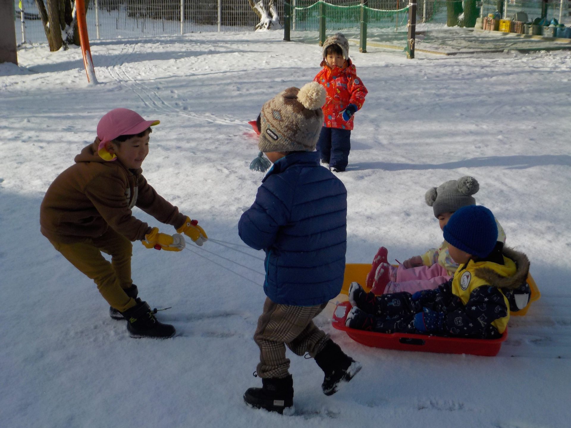 「ソリ、ひいてあげるよ」と2歳児さんと遊ぶ年中さん。