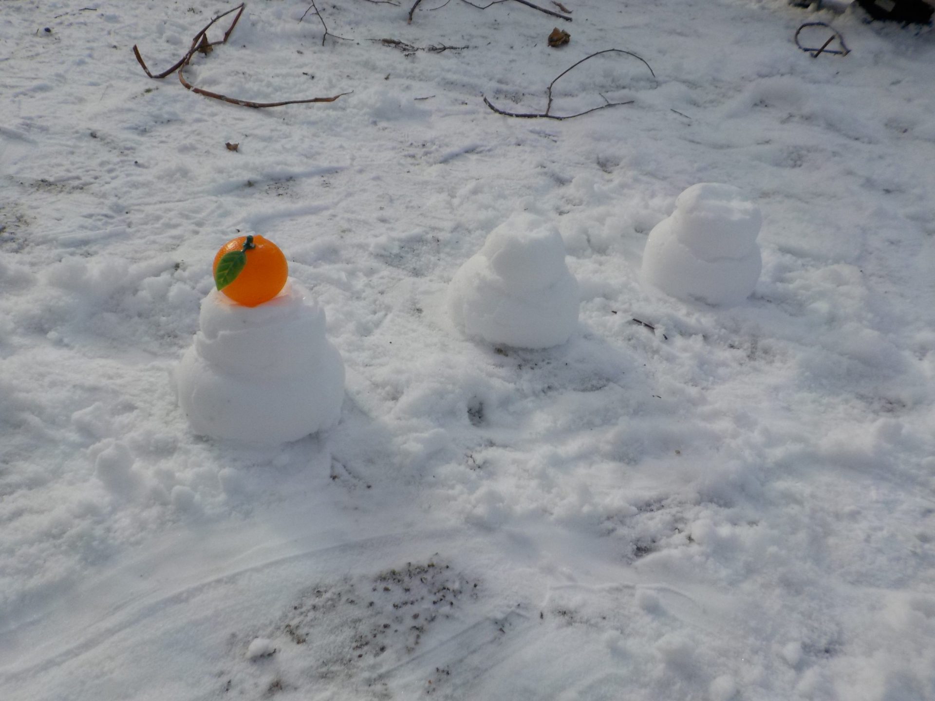 雪のお餅たくさんできたよ!(鏡餅の空き容器に雪をつめて作っています)