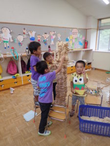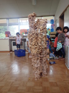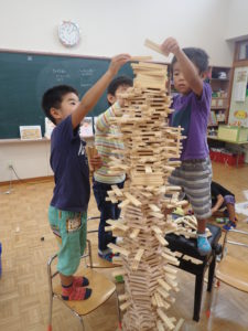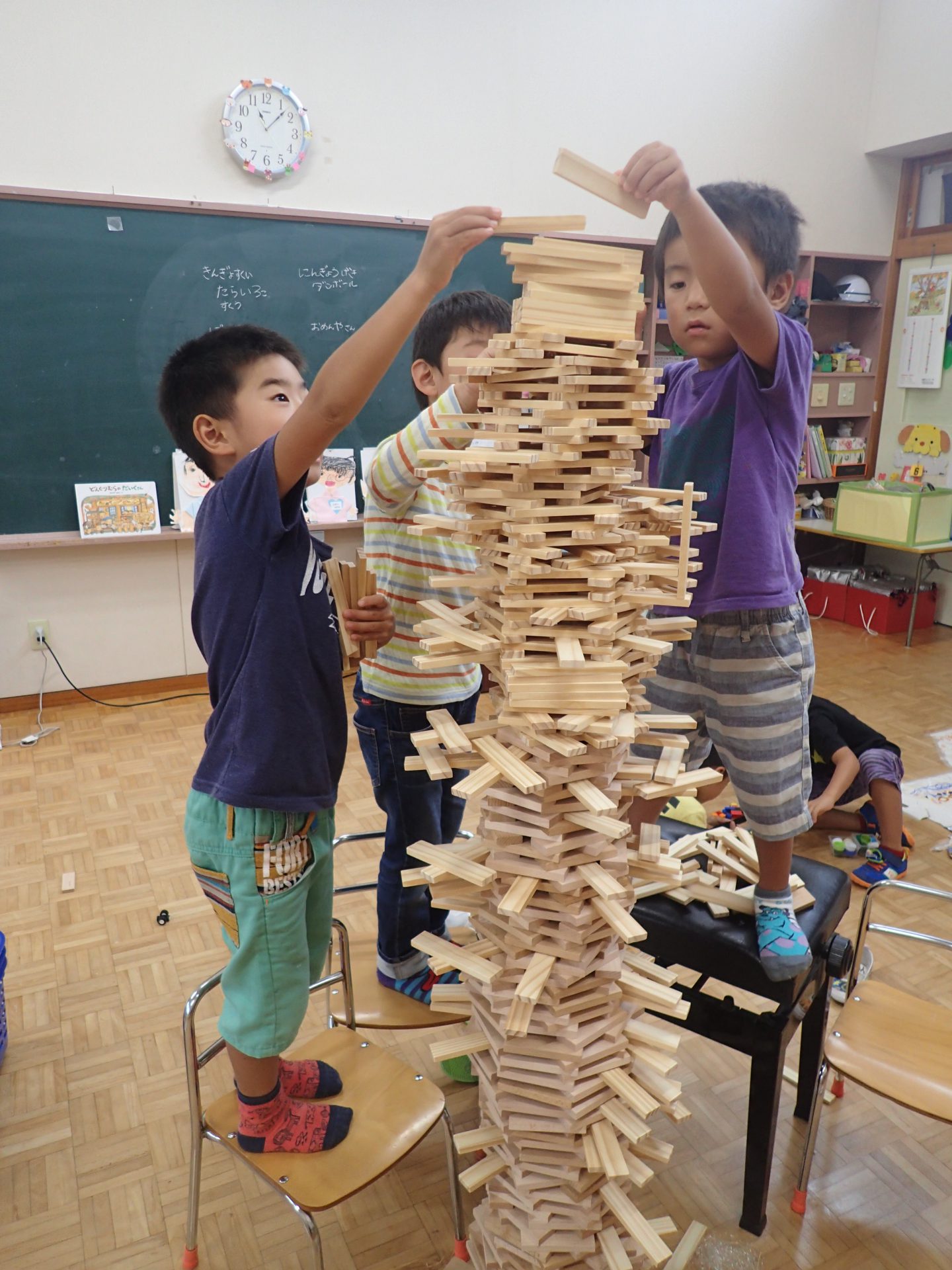 今では家を作ったり上へ上へ重ねて高く積み上げることを友達と協力して楽しんでいます。こんなにたかーく積み上げて!!喜びに満ち溢れていました!!