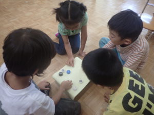 「おはじきをキャップにあてて落としたらもらえるよ」と分かりやすく友達に教える姿も見られました。