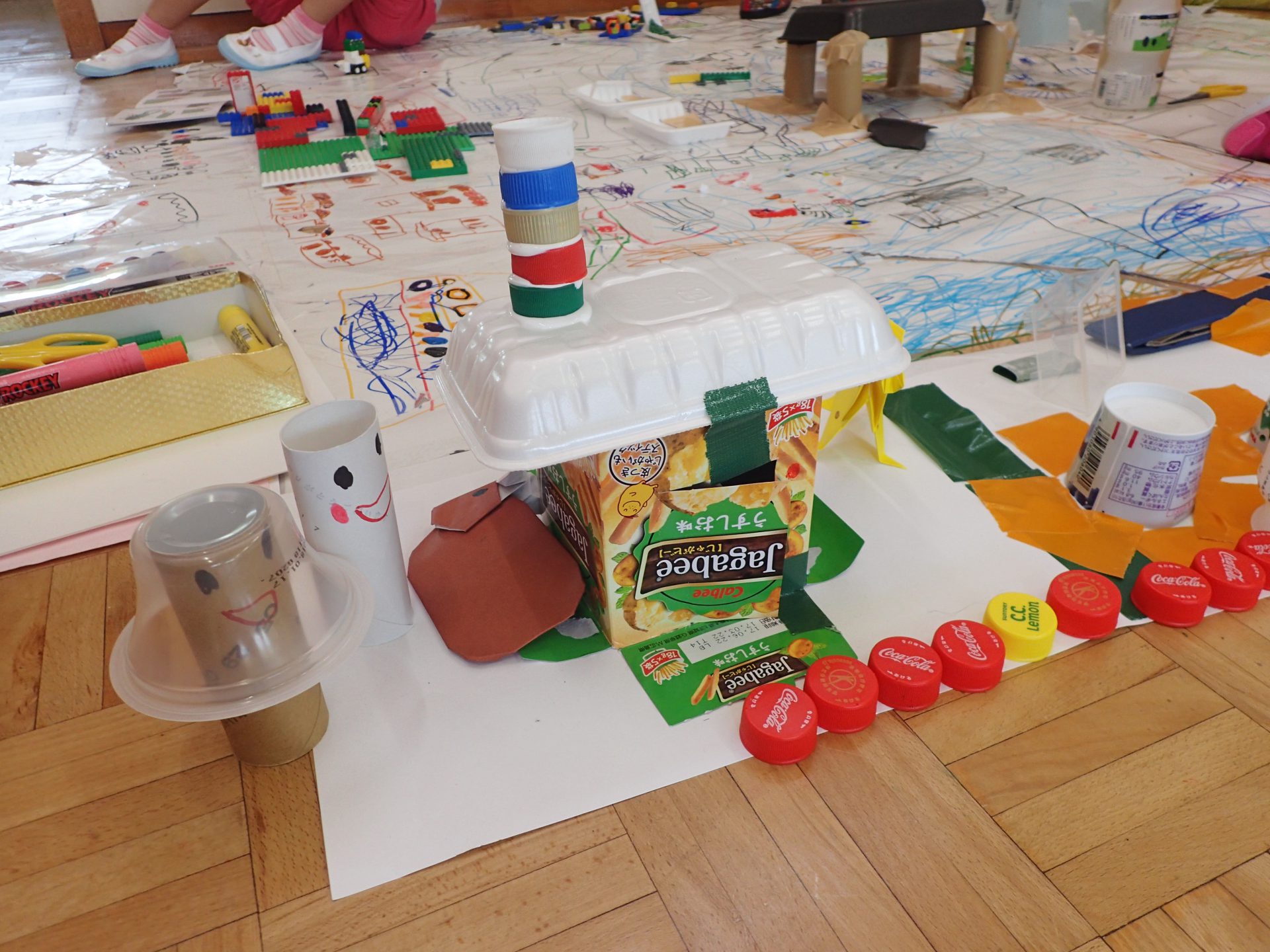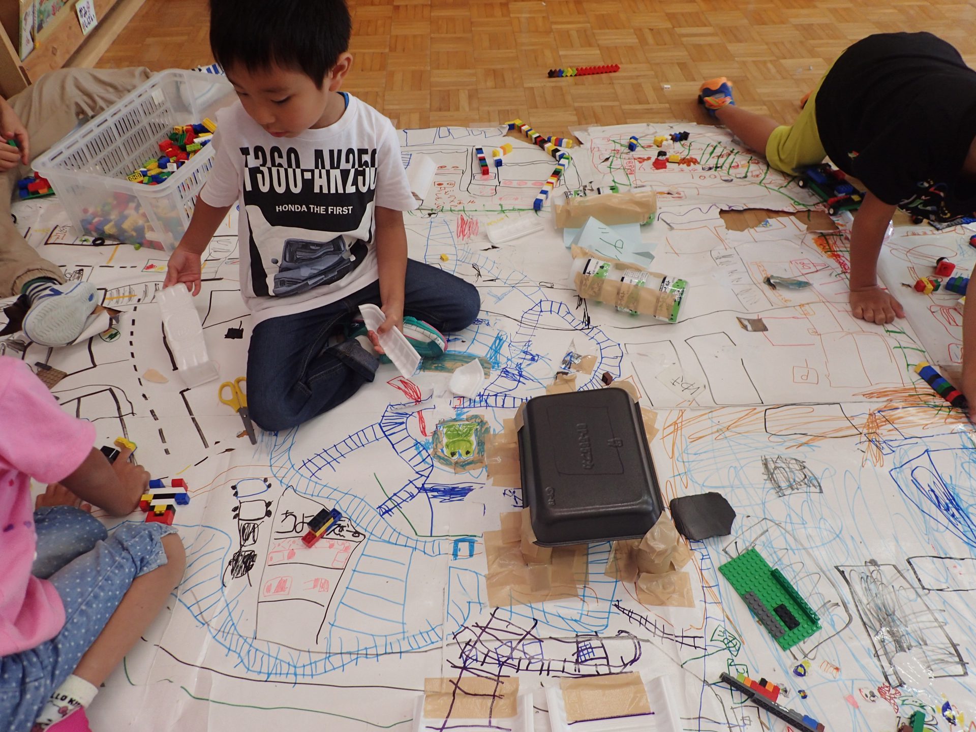 地図をつなげて「レゴの街」。日に日に地図が大きくなったり、色々な素材を使って家やトンネルを工事して作ったり楽しい街にどんどん変身していくのでもう毎日ドキドキ。ワクワク。