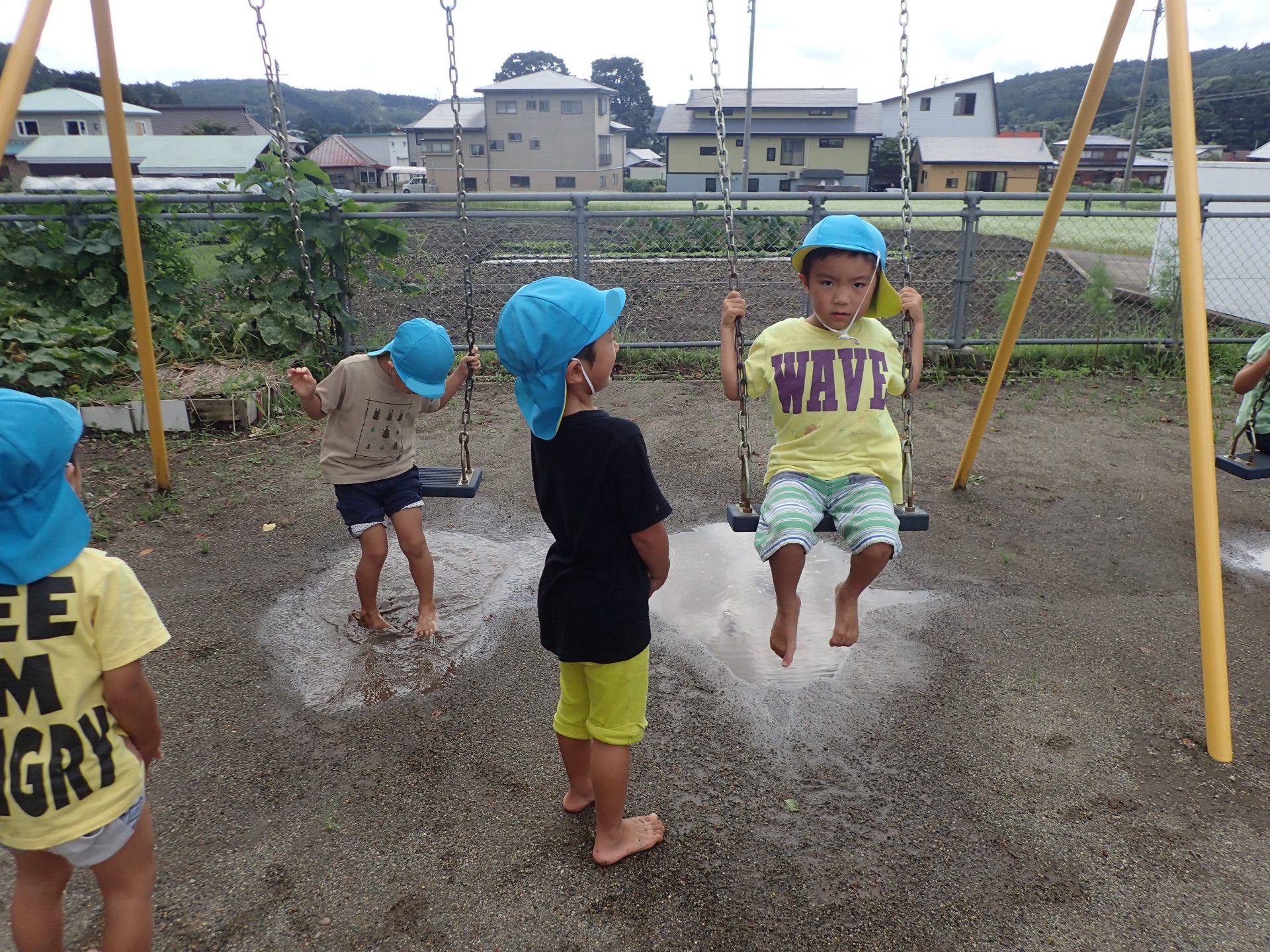 「みんな!!雨もう降ってないよ」「外いこう」と、今日は裸足になって園庭へ。