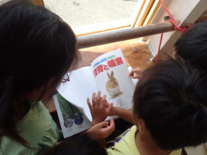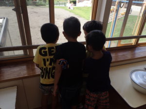 ご飯が終わり窓際に子ども達が集まって何かを見ていました。