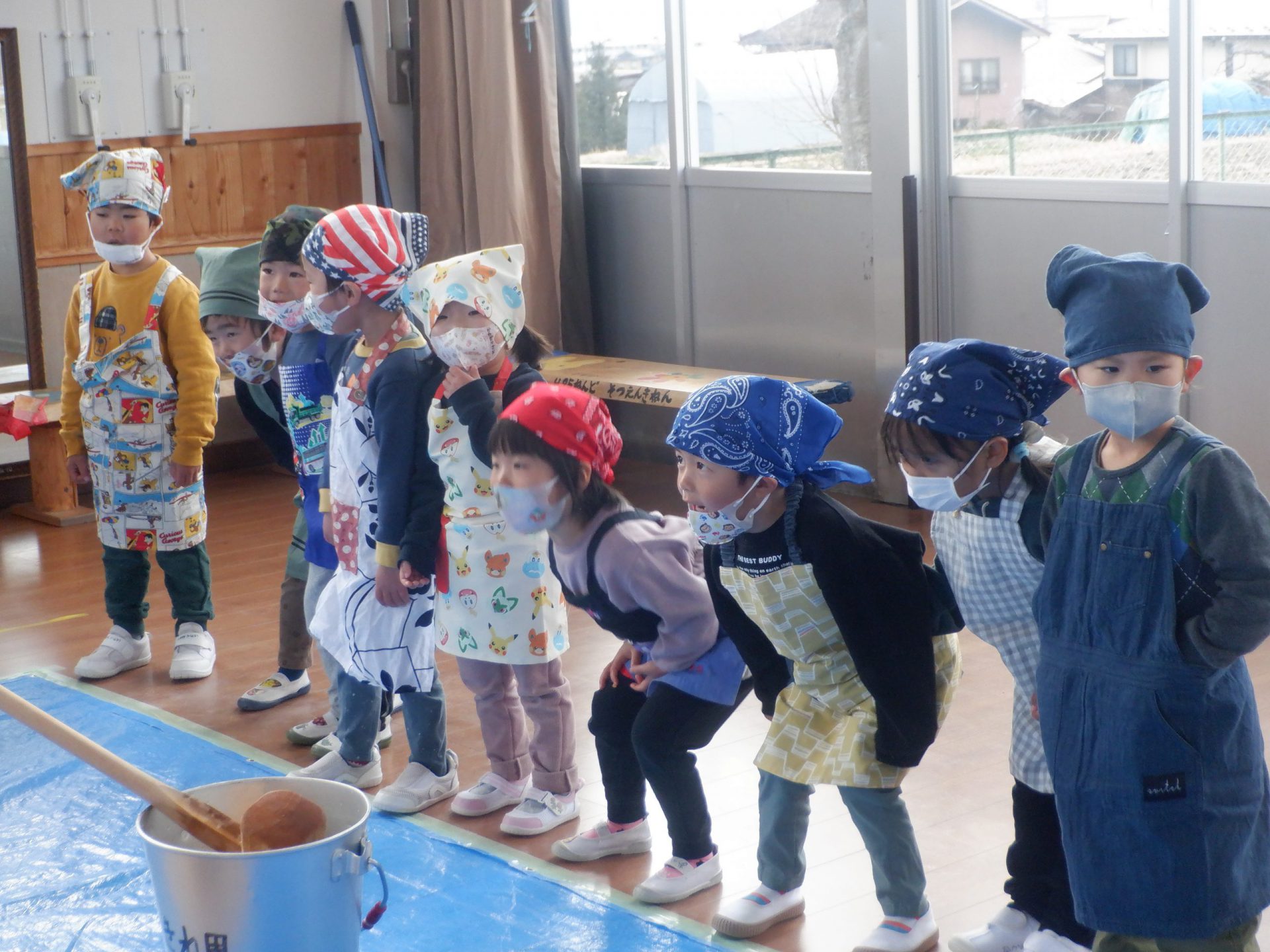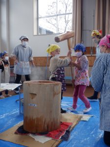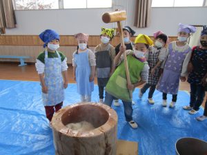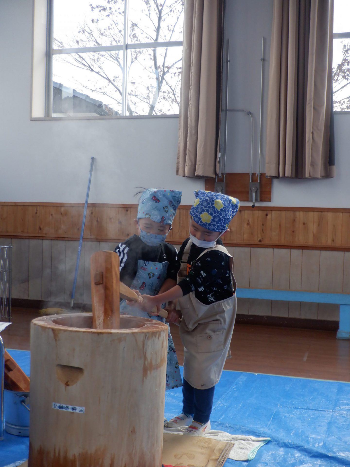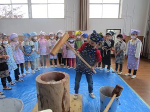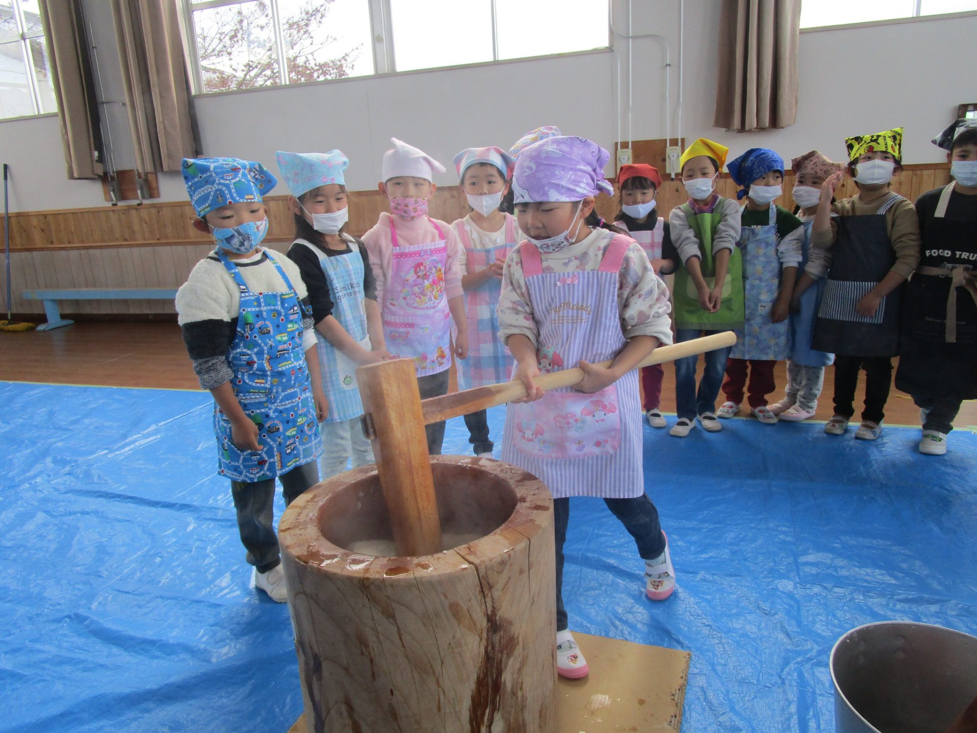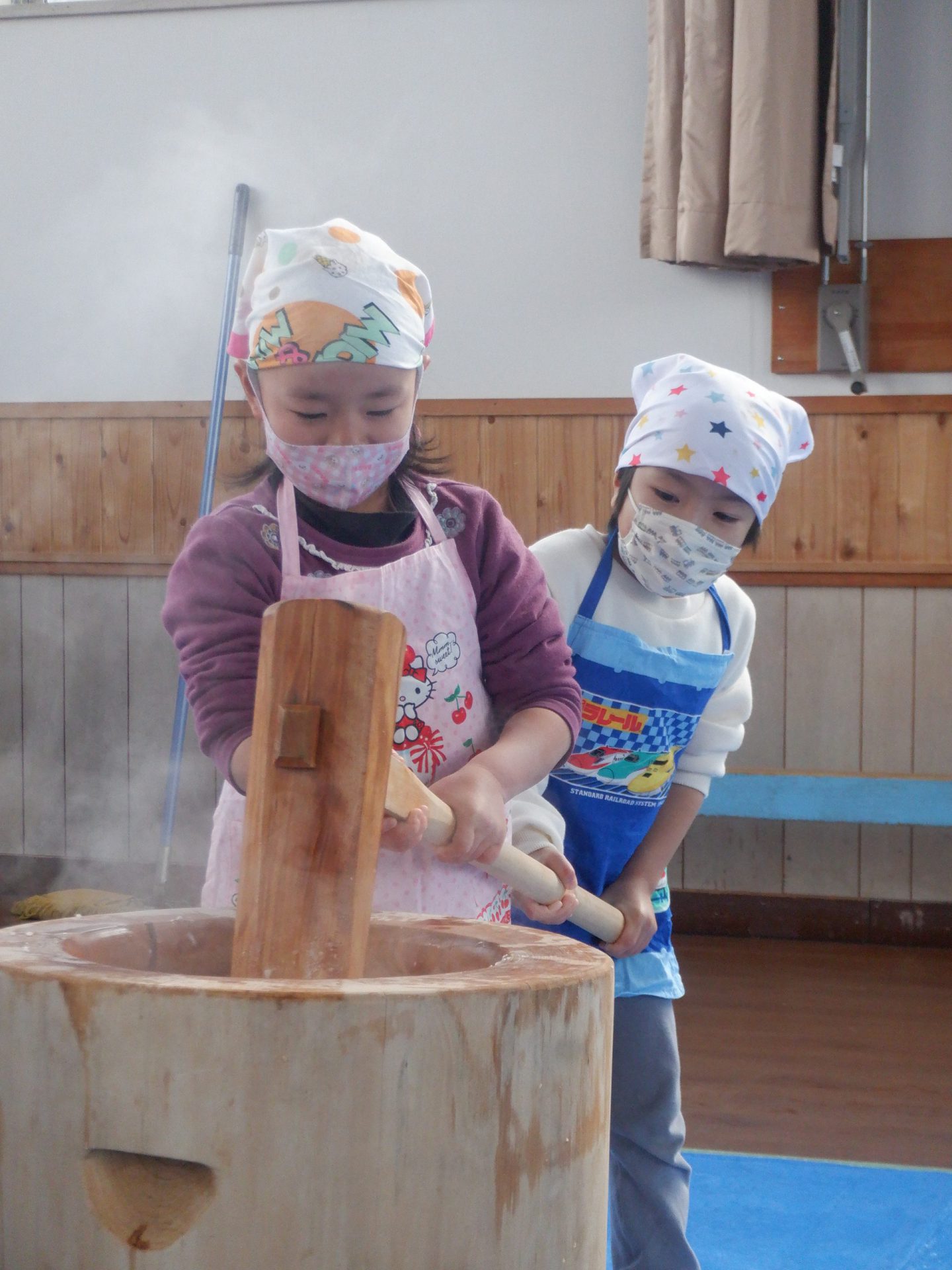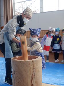 ・保護者会にも協力してもらい、もち米を釜戸で蒸すところから、臼と杵でついて餅になるまでを実際に見たり経験したりすることができ、日本の昔ながらの伝統や行事を経験することができたと思う。こういった行事の中で、食への興味、作ることの大変さ、食べられることのありがたみや楽しさを感じながら、日本の伝統や行事に親しんでいってほしい。