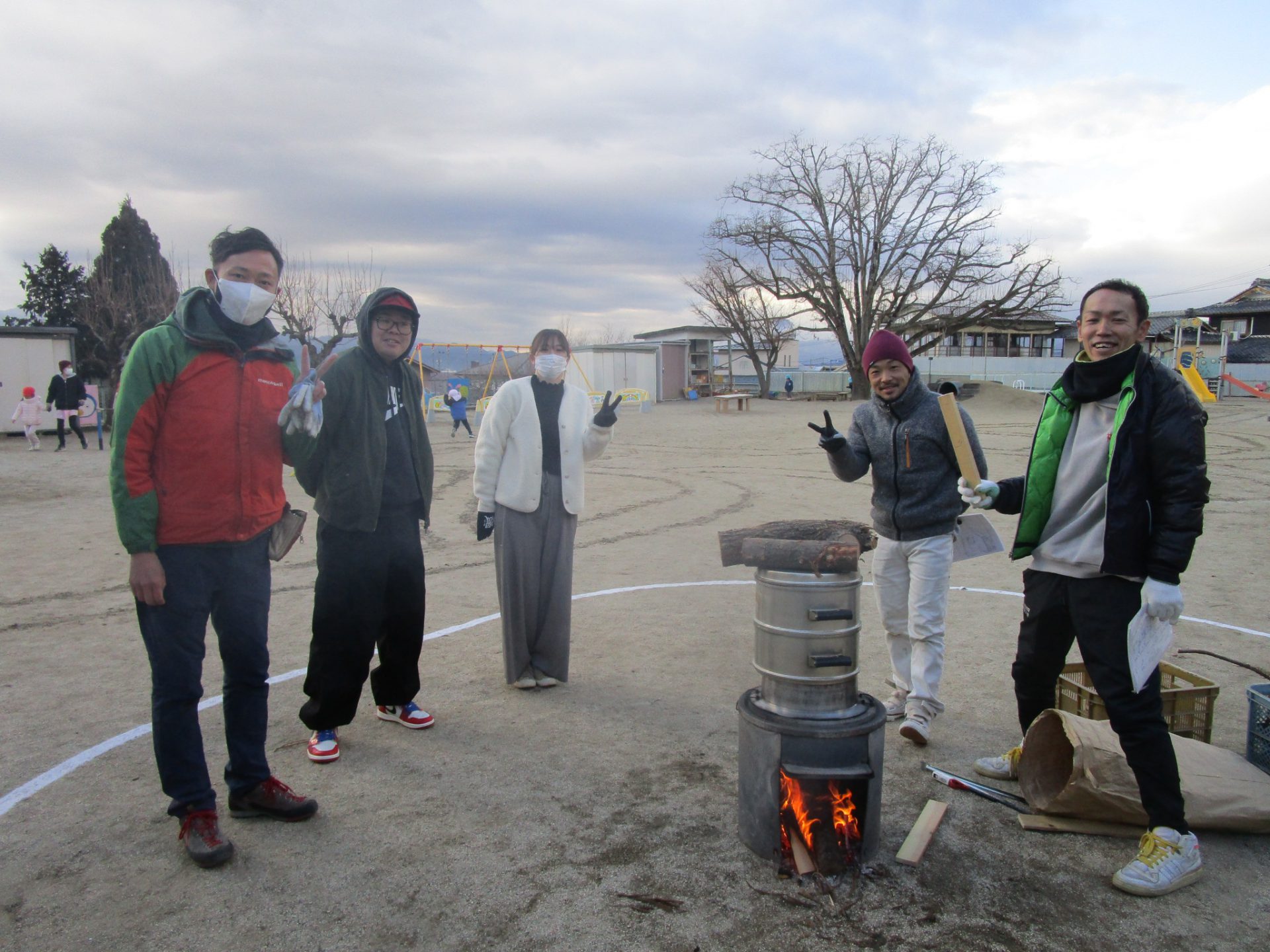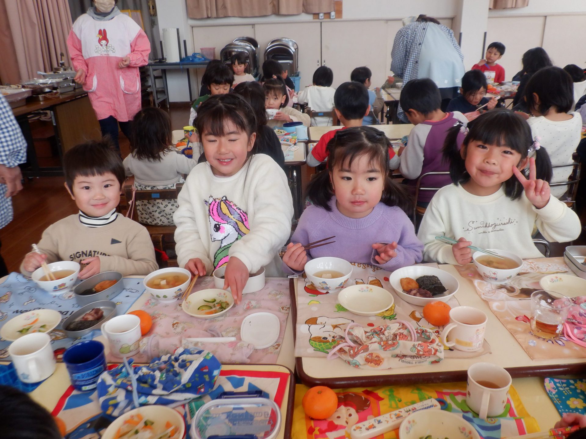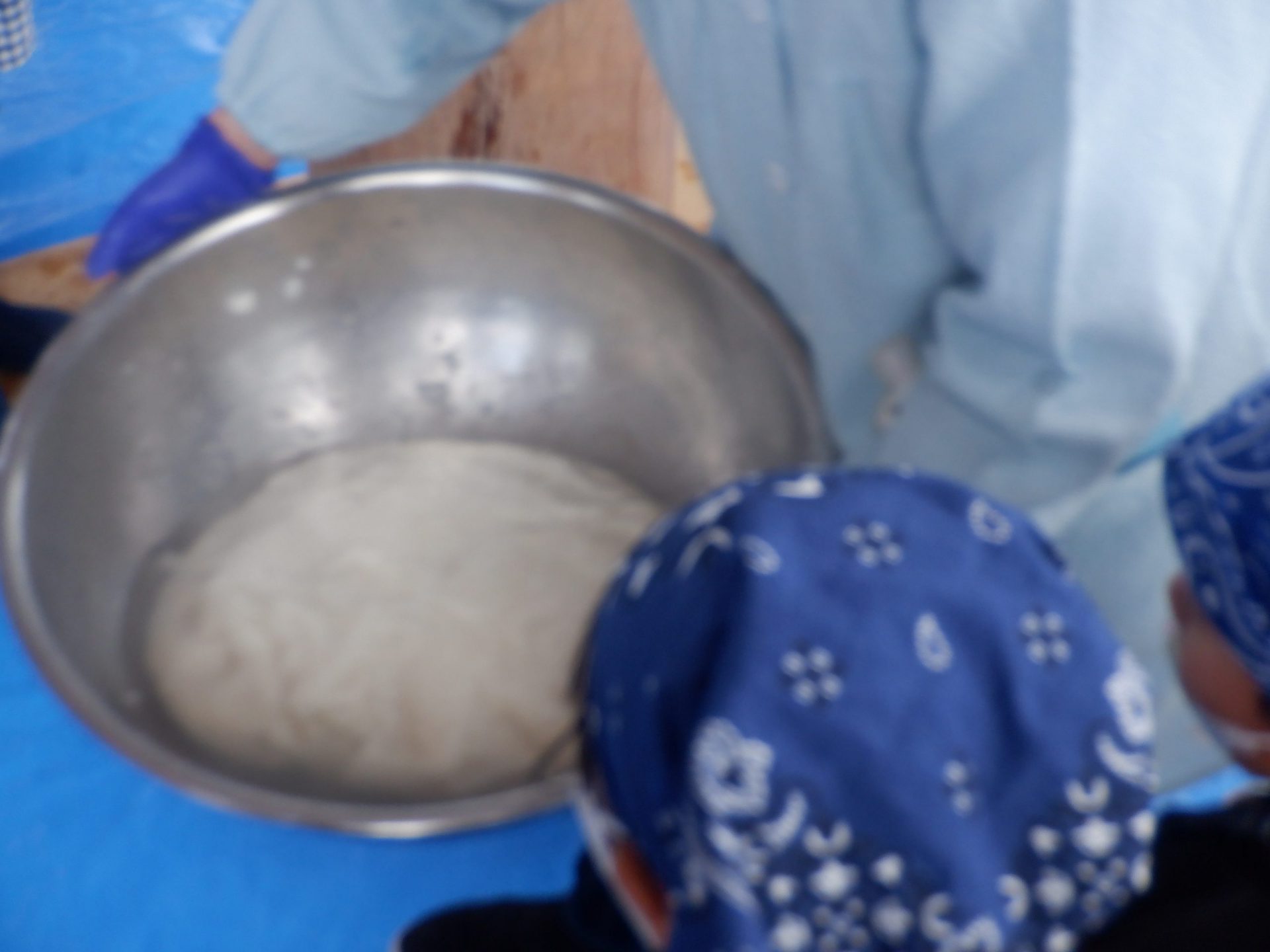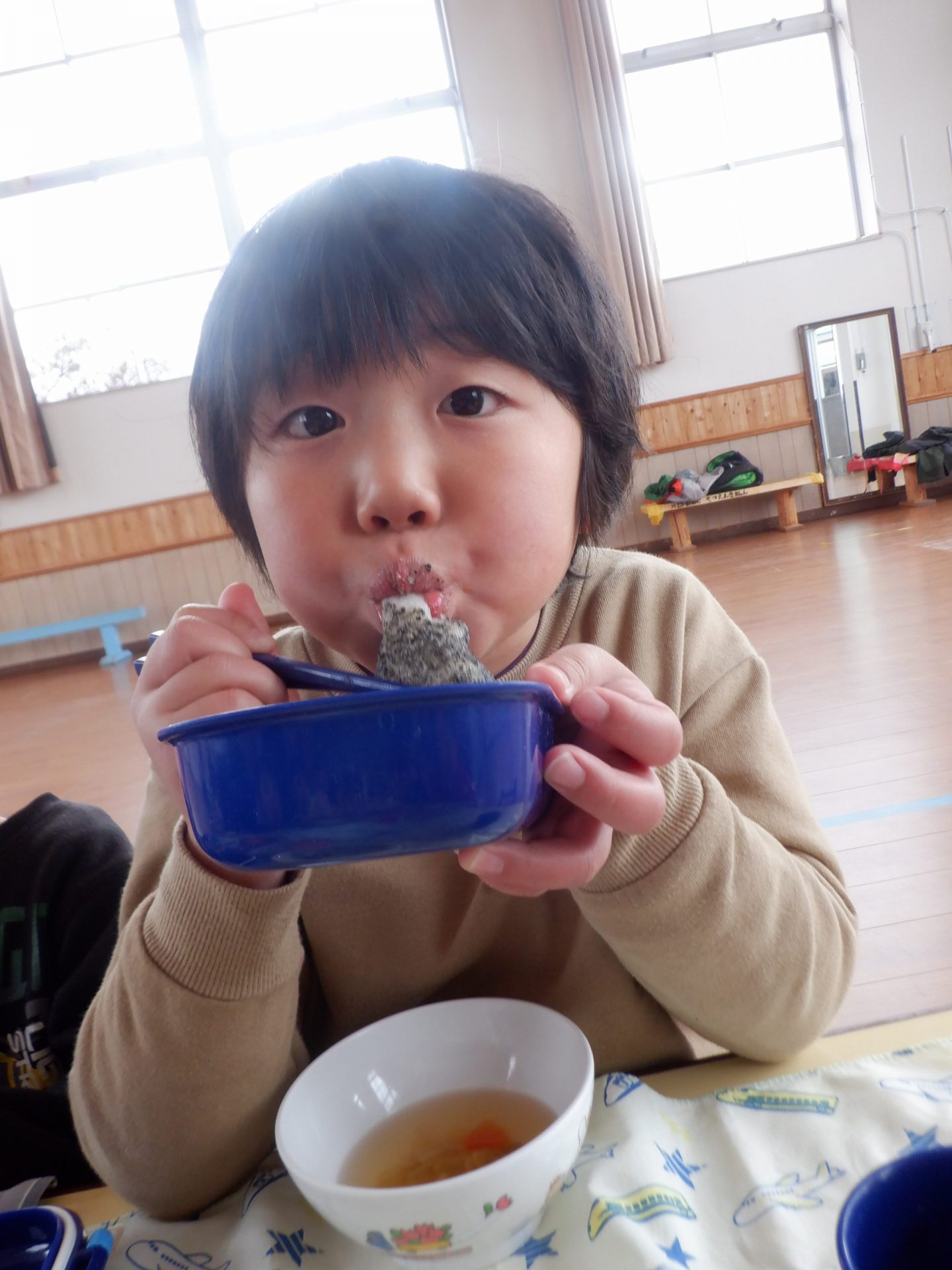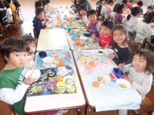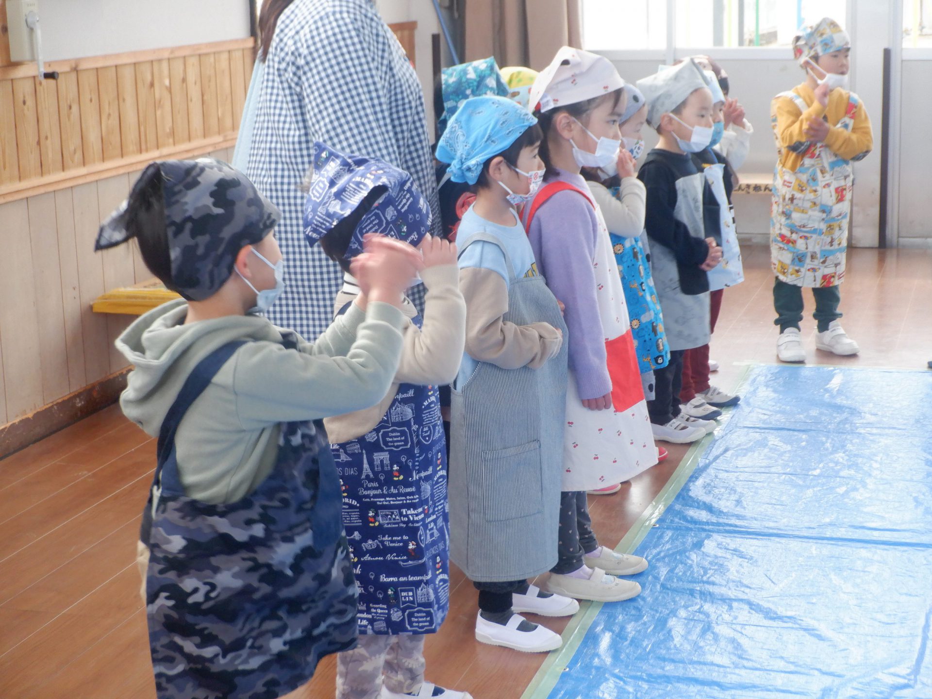 ・保護者会にも協力してもらい、もち米を釜戸で蒸すところから、臼と杵でついて餅になるまでを実際に見たり経験したりすることができ、日本の昔ながらの伝統や行事を経験することができたと思う。こういった行事の中で、食への興味、作ることの大変さ、食べられることのありがたみや楽しさを感じながら、日本の伝統や行事に親しんでいってほしい。