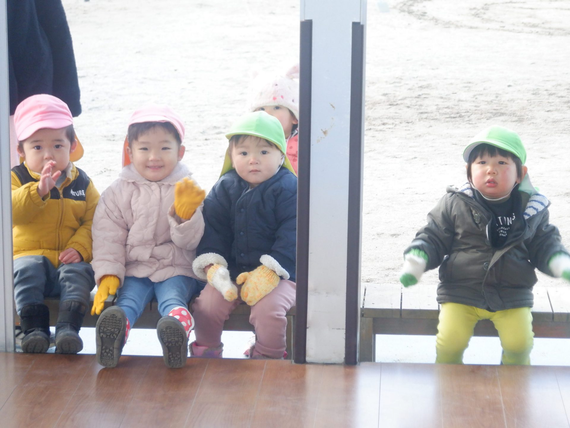 未満児さんもテラスから大きい友だちの応援に、覗きに来てくれました。