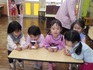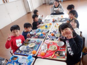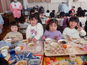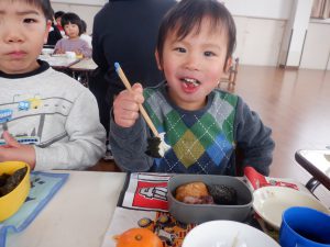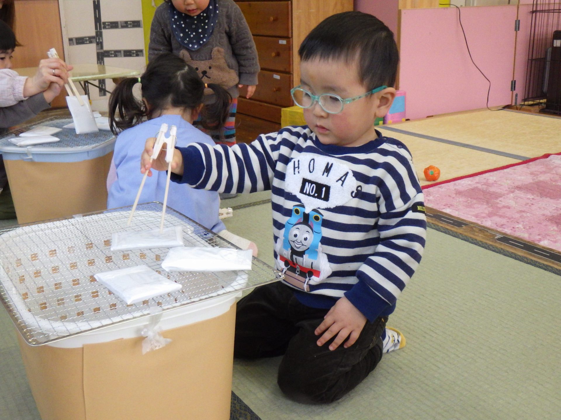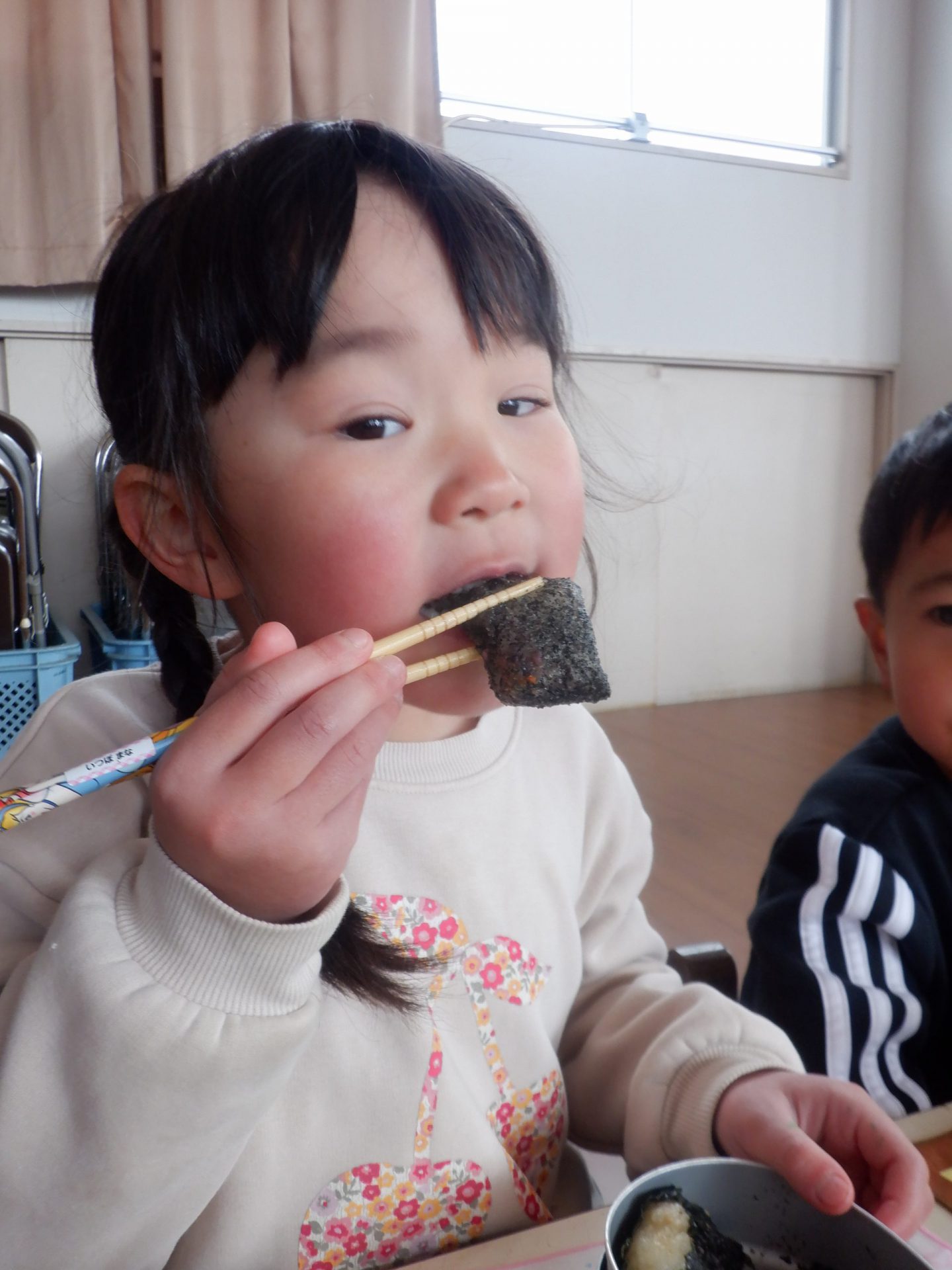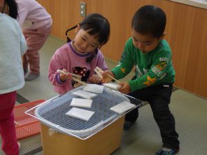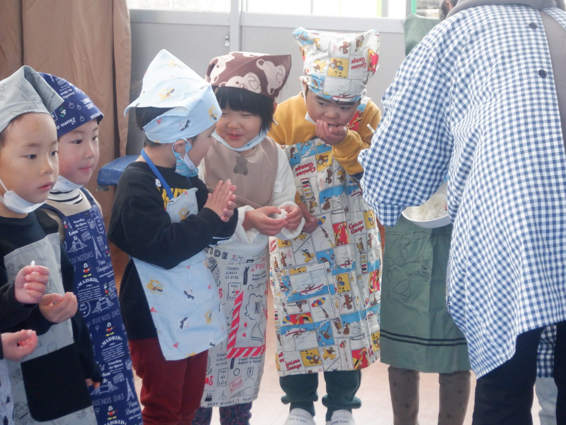 ・友だちが餅をついているところを見て、応援したり一緒に掛け声をかけたり、大きい年齢の友だちの姿を真似するなど、興味を持って参加していた。みんなでついた餅を、保育園のみんなで一緒に食べ、美味しさを共有したり会話したりすることができ、友だちと一緒に作って食べる事を楽しめたのではないか。
