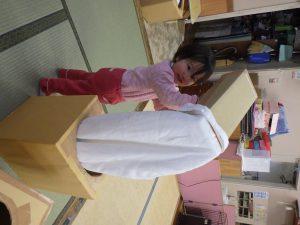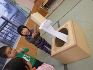 後日、1月の誕生会で未満さんは餅つきごっこをしました。