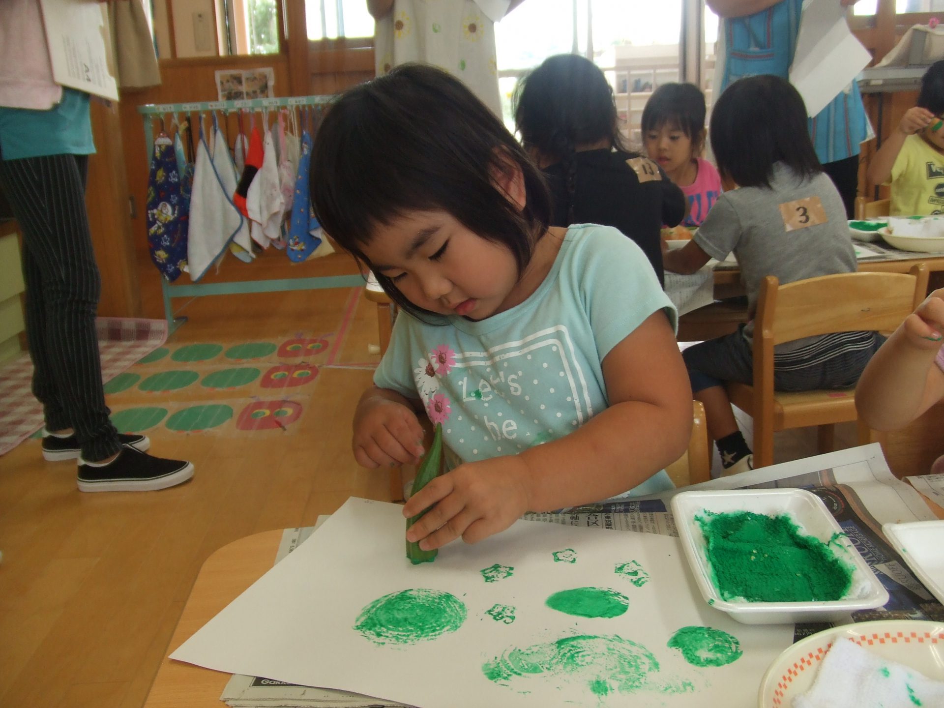 濡れぞうきんに絵の具を染み込ませて、スタンプ台。切った野菜をペッタン!ペッタン!