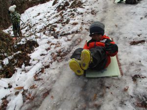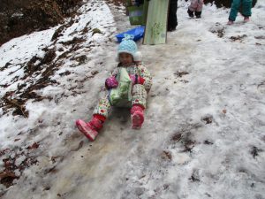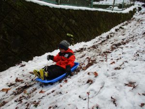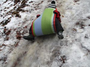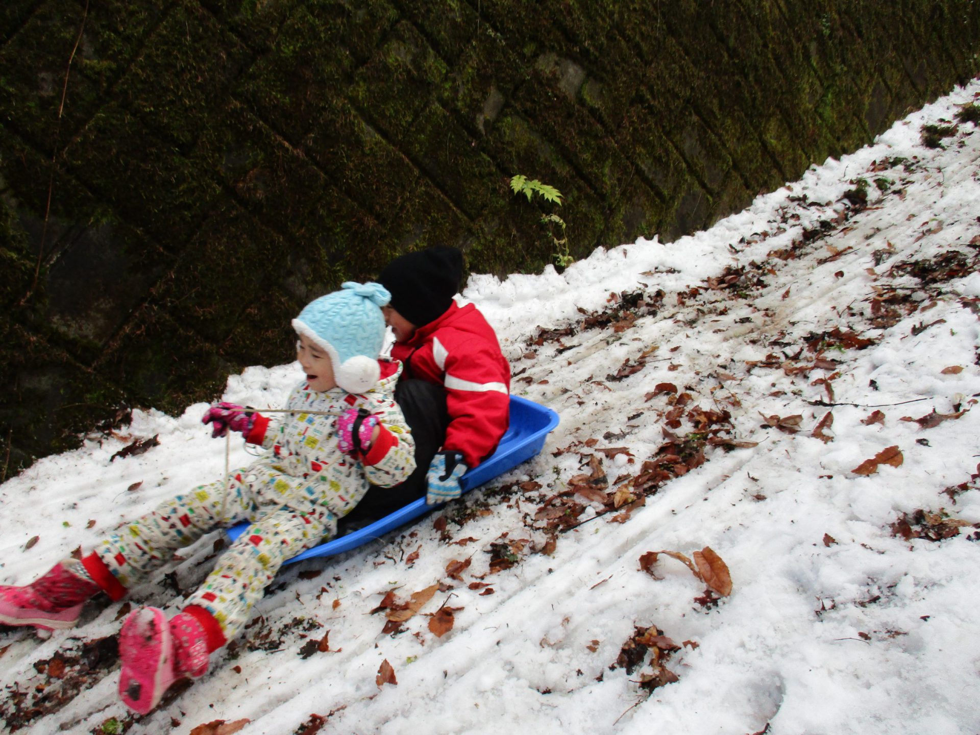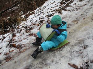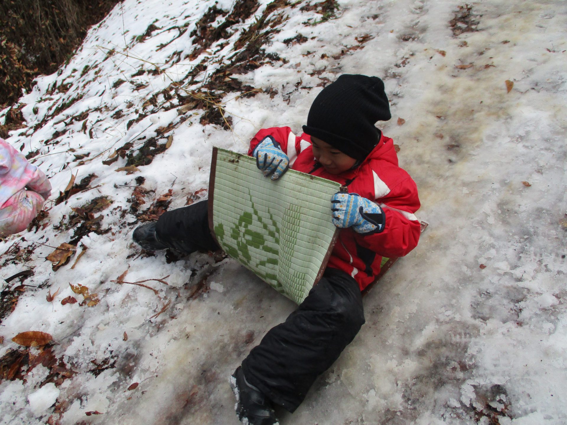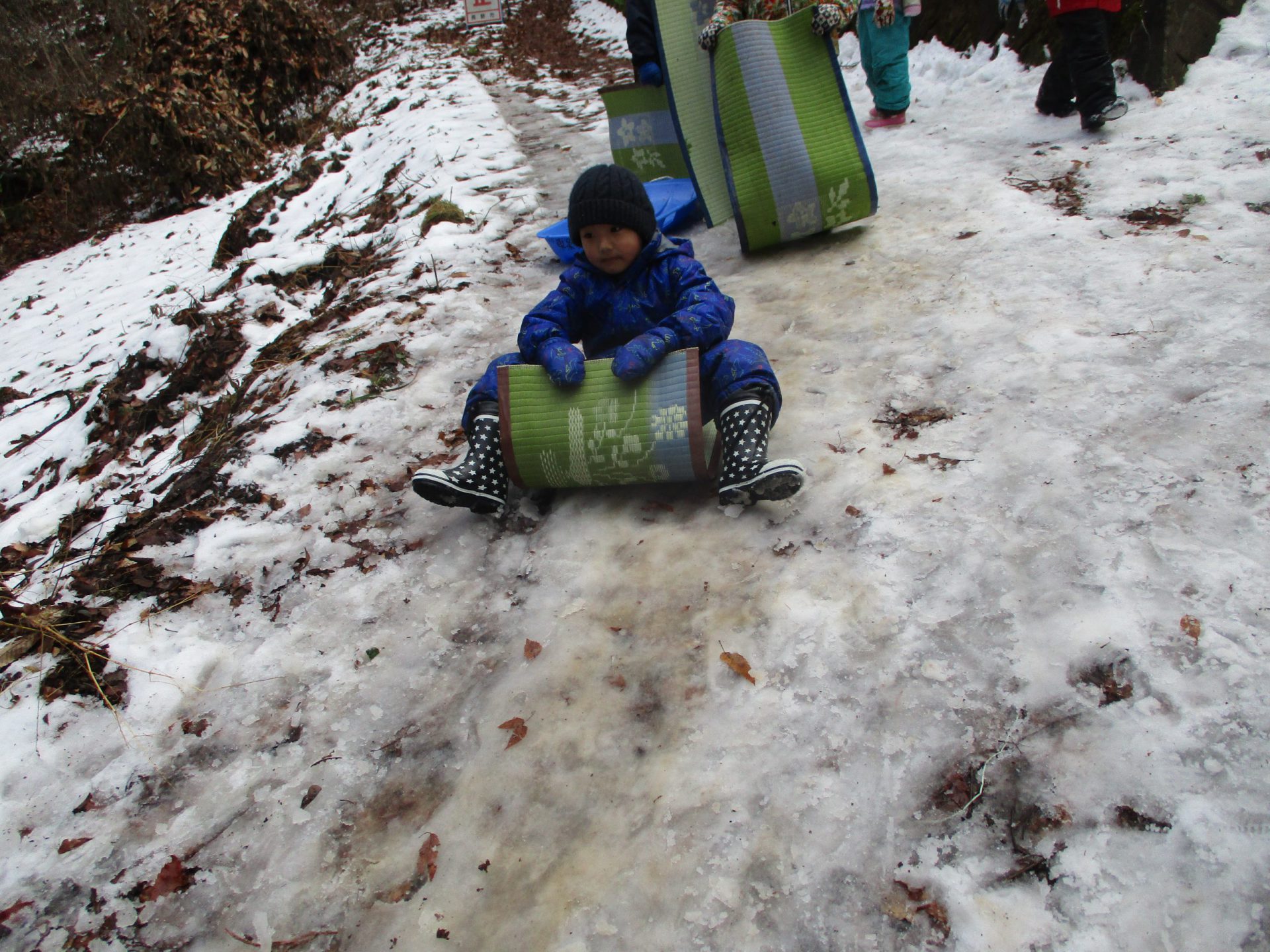 昨日の雨で、雪が溶けシャーベット状になってしまい、そりやござで滑るかな??😓考える前にやってみよう👍