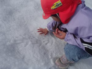 まだ少ししか雪が積もっていなかった頃、雪に手をつけて「手形できた!」と雪の手形をたくさん押して楽しんでいました。