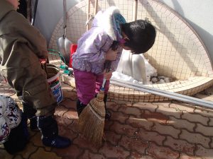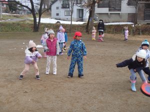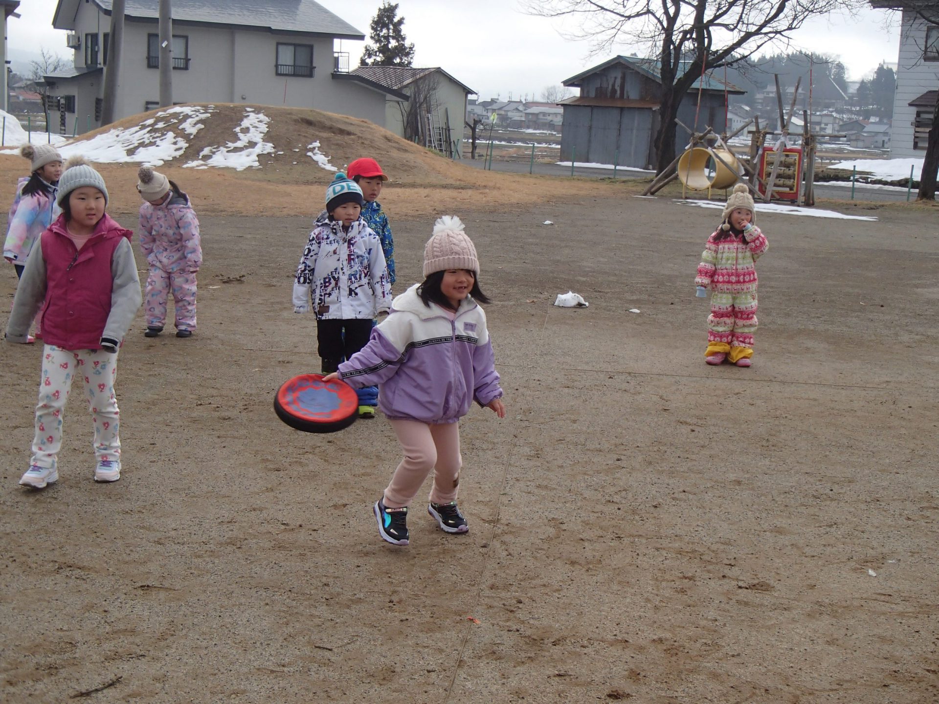 早く雪が降らないかなあと期待しながら、冬の遊びとしては珍しく園庭でドッチビーを楽しんでいました。